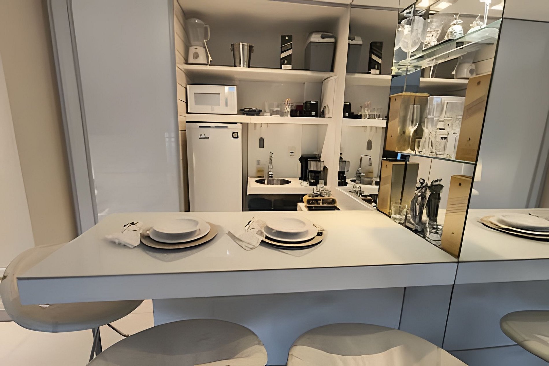 Cozinha compacta junto à sala, com utensílios domésticos. Possui geladeira, microondas, cooktop 2 bocas, sanduicheira e liquidificador.