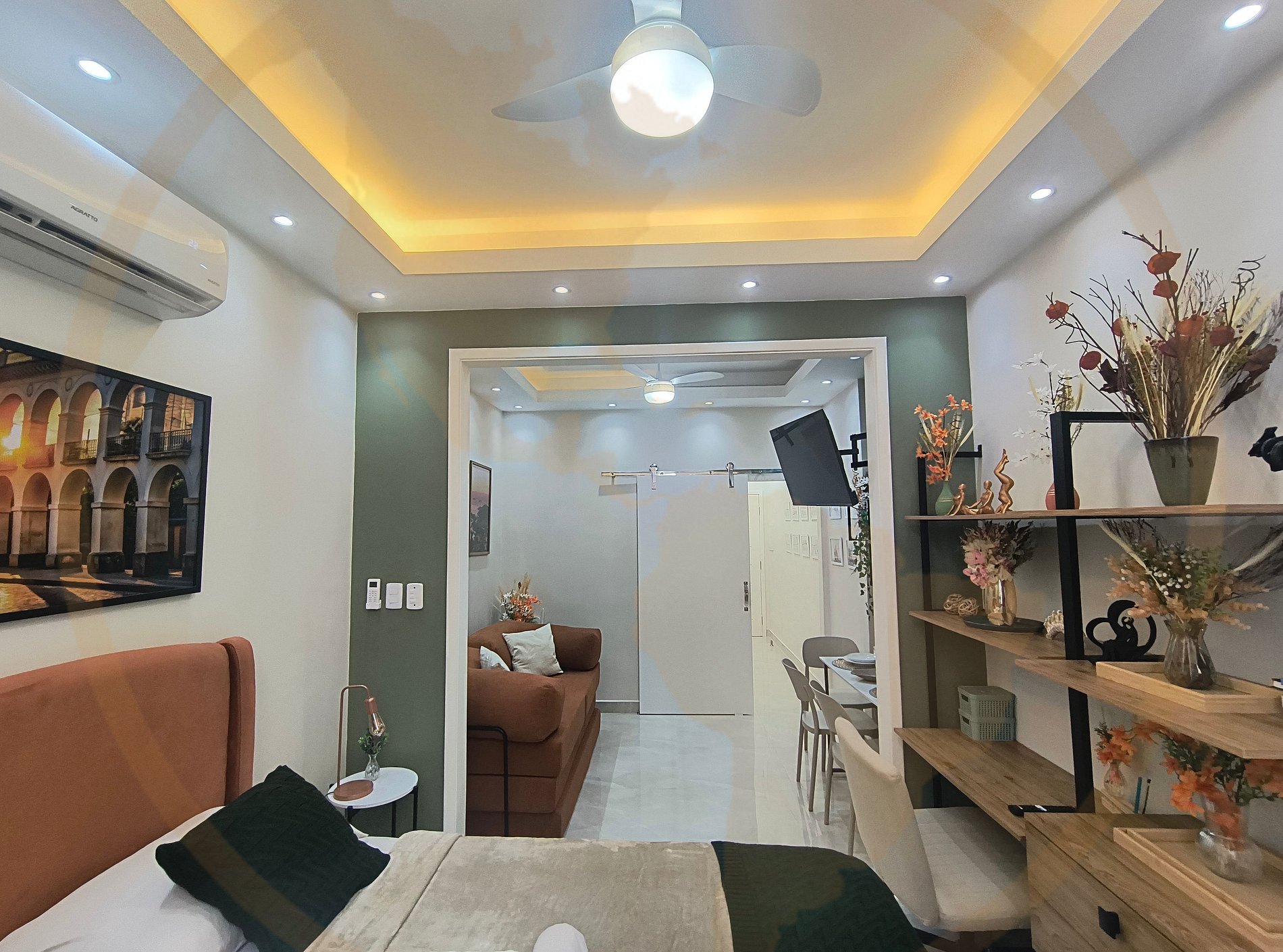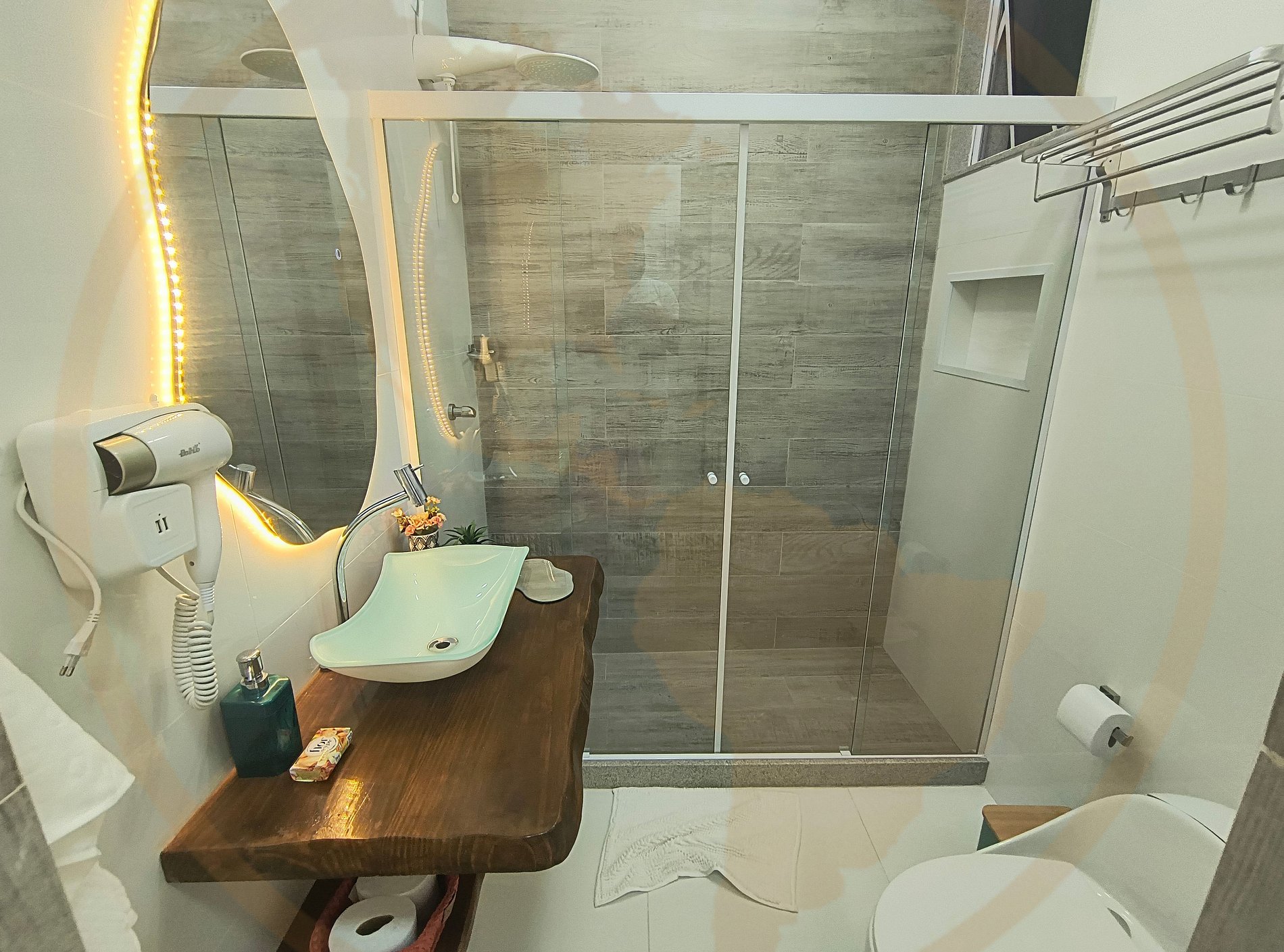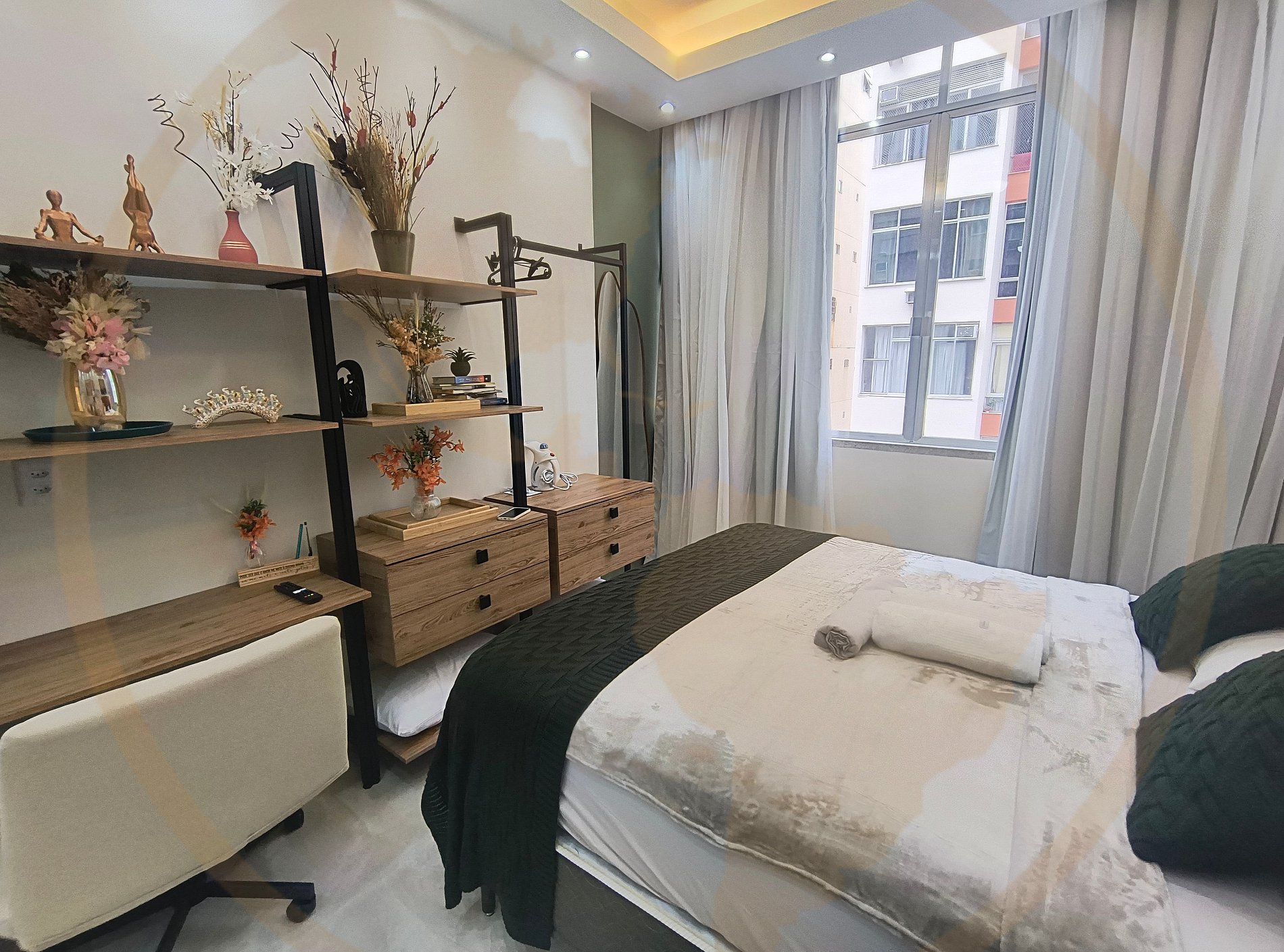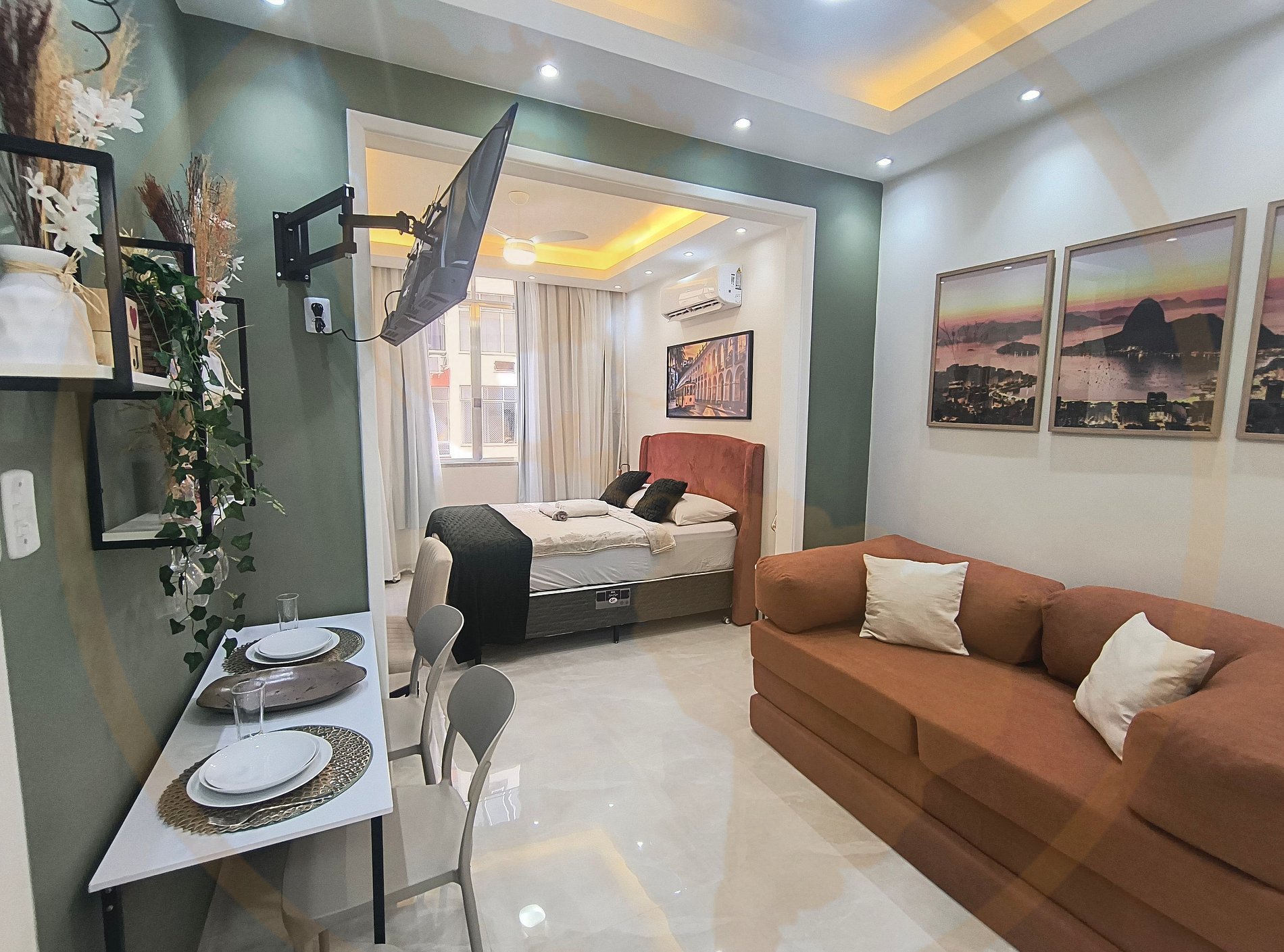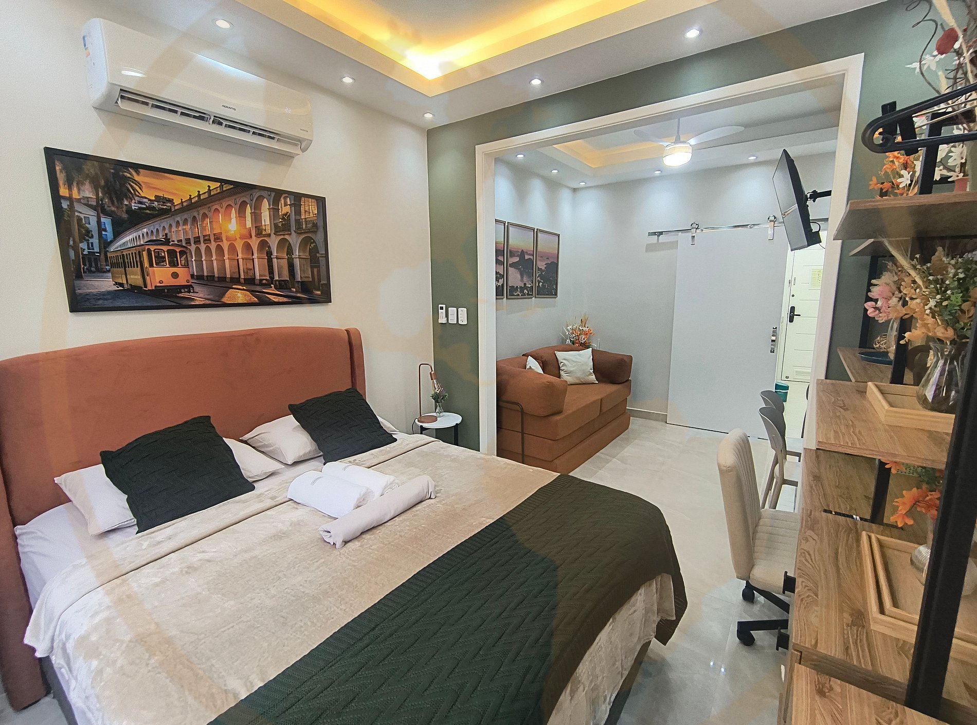O Essence Lapa é um estúdio boutique recém-reformado, no coração cultural do Rio de Janeiro. Um espaço aconchegante, moderno e cheio de personalidade, pensado para oferecer conforto, praticidade e uma experiência autêntica na Lapa. O apartamento conta com Cozinha, Banheiro e Sala/Quarto . A decoração traz tons naturais, arte carioca e iluminação acolhedora, criando um ambiente perfeito para relaxar após explorar a cidade. Quarto & Sala (Studio Integrado) Um ambiente amplo e bem distribuído, decorado com tons terrosos, verde musgo e elementos que remetem à essência carioca. No espaço você encontra: • Cama Queen super confortável • Roupa de cama de alta qualidade • Sofá-cama moderno, ideal para acomodar até 3 hóspedes no total • TV moderna Smart • Ar-condicionado silencioso • Iluminação aconchegante planejada • Quadros em aquarela com ícones do Rio, trazendo charme e acolhimento • Espaço Home Office • Mesa de Jantar Cozinha Completa & Moderna A cozinha do Essence Lapa foi projetada com muito carinho e autenticidade. Ela possui: • Bancada em granito • Cooktop • Frigobar • Armários planejados • Panelas, utensílios, louças e taças • Cafeteira • Microondas • Air Fryer • Sanduicheira • Mixer O ambiente tem acabamento impecável e decoração harmoniosa — perfeita tanto para uso quanto para fotos. Banheiro Elegante & Funcional O banheiro foi totalmente reformado para proporcionar leveza, modernidade e bem-estar. Você encontra: • Box amplo em vidro • Nicho • Chuveiro forte e relaxante • Espelho grande com design clean com led • Secador de cabelo • Decoração em tons claros, trazendo sensação de spa O ambiente foi pensado para quem busca uma estadia prática e ao mesmo tempo sofisticada, seja viajando a lazer, trabalho ou turismo cultural.