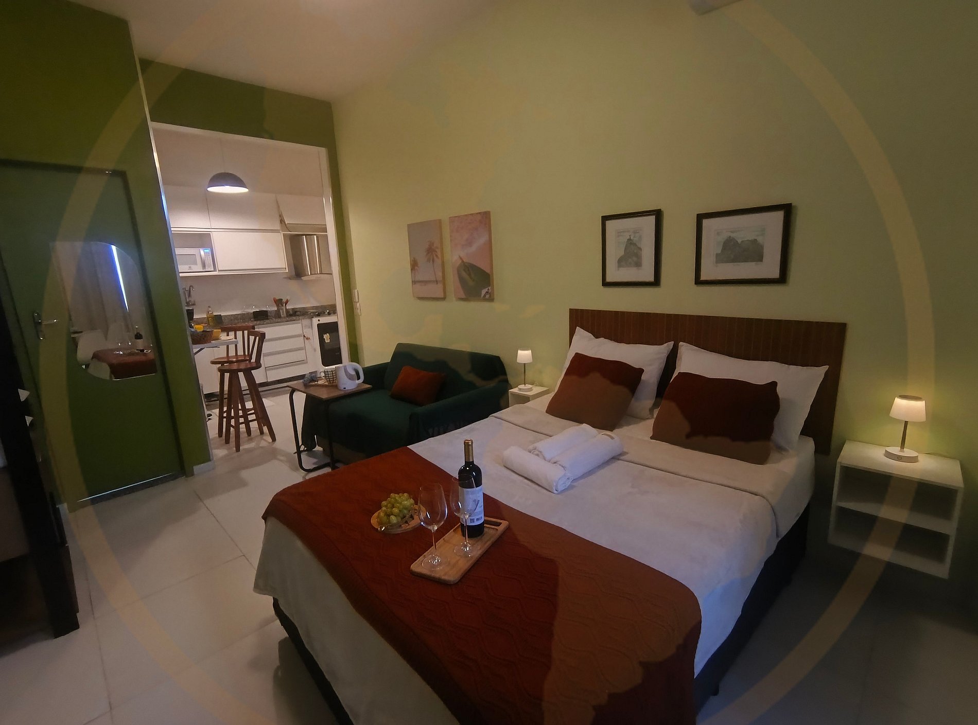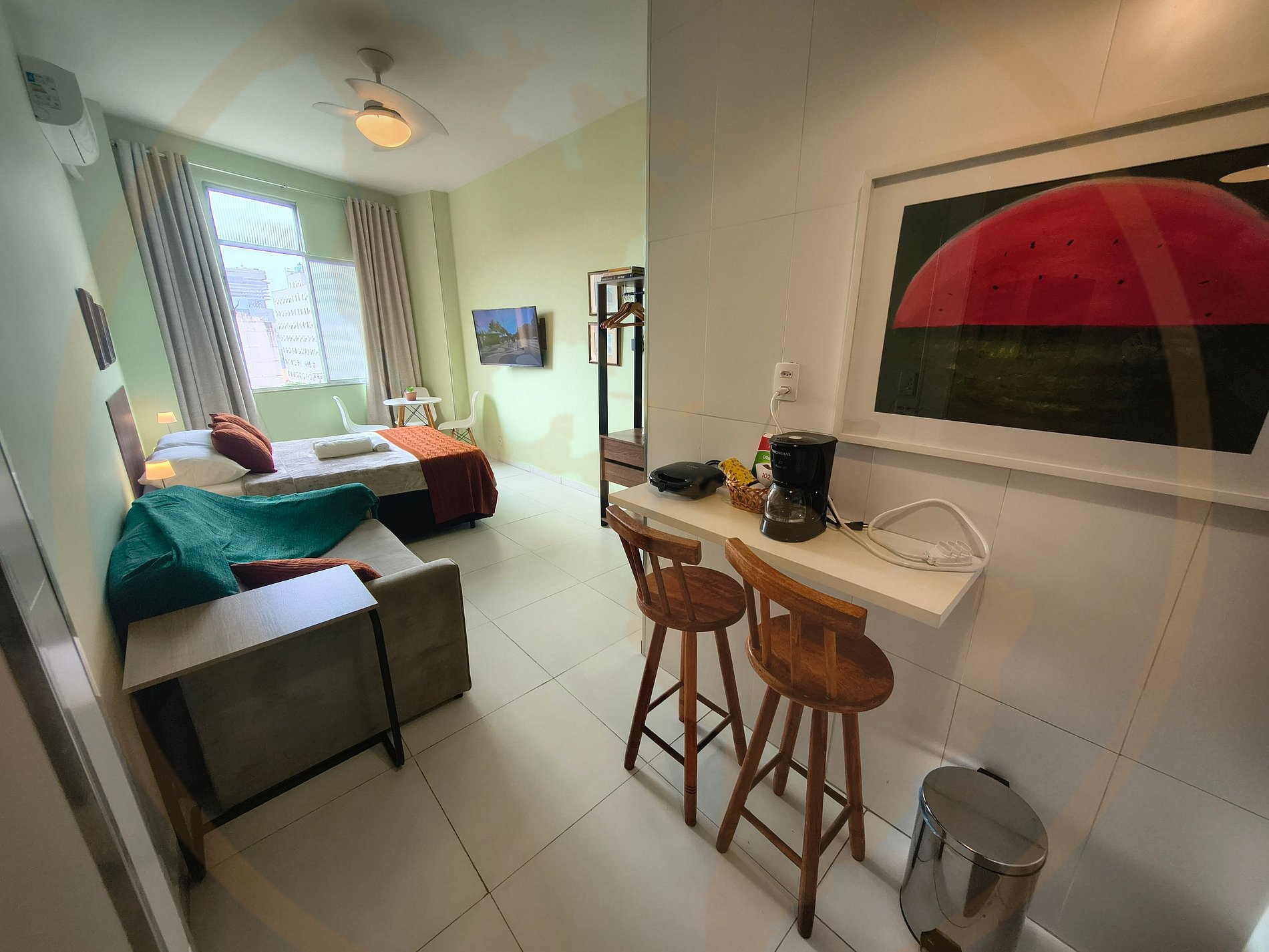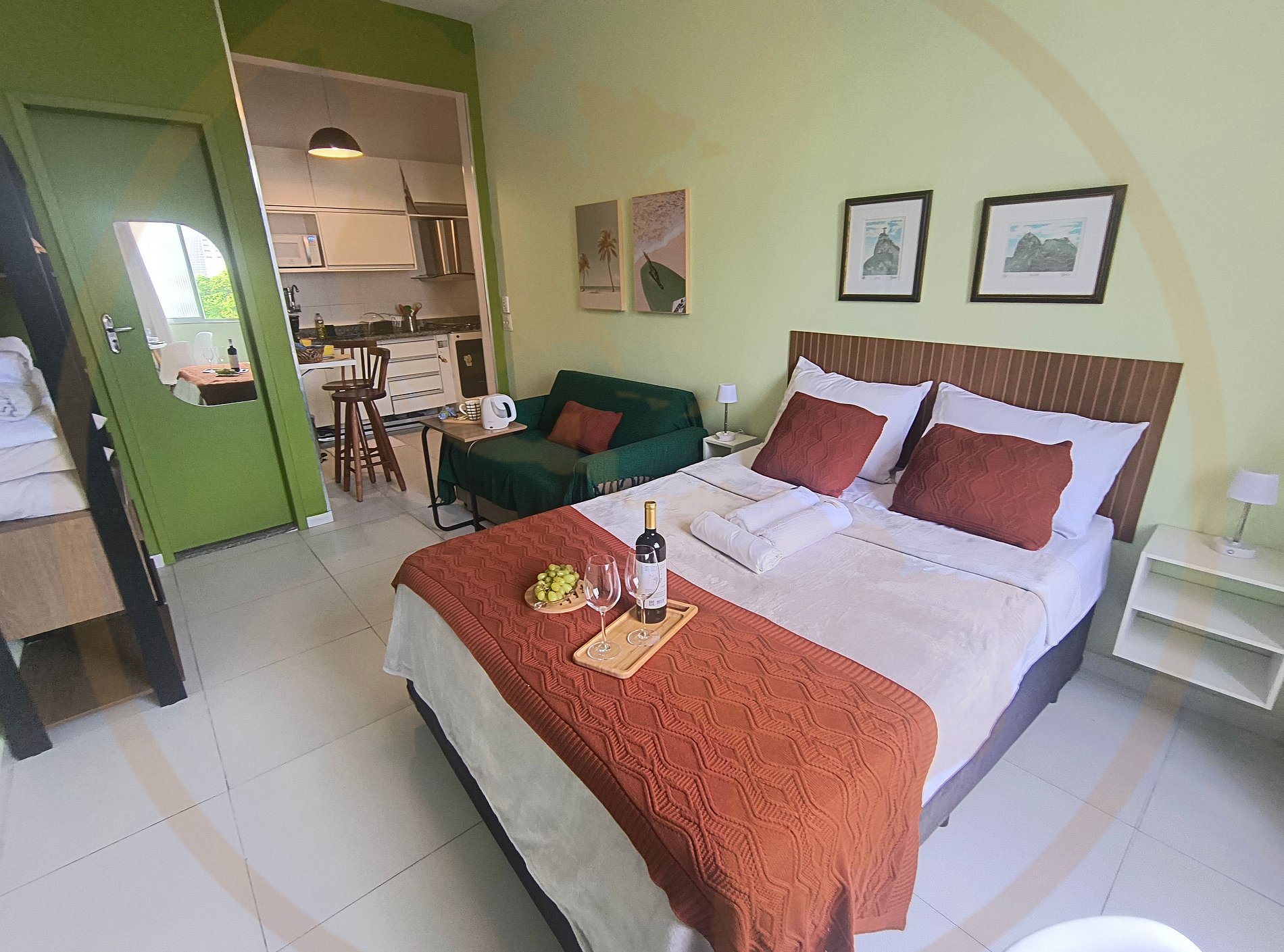 O estúdio oferece todo o conforto necessário para sua estadia, com cozinha equipada e ambiente planejado para 4 hóspedes.