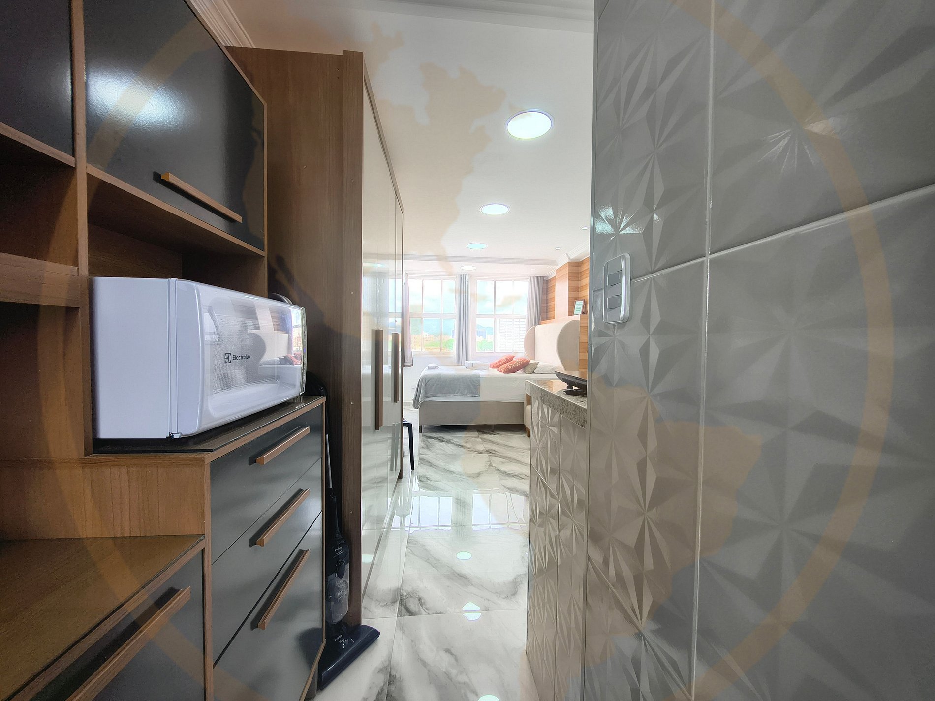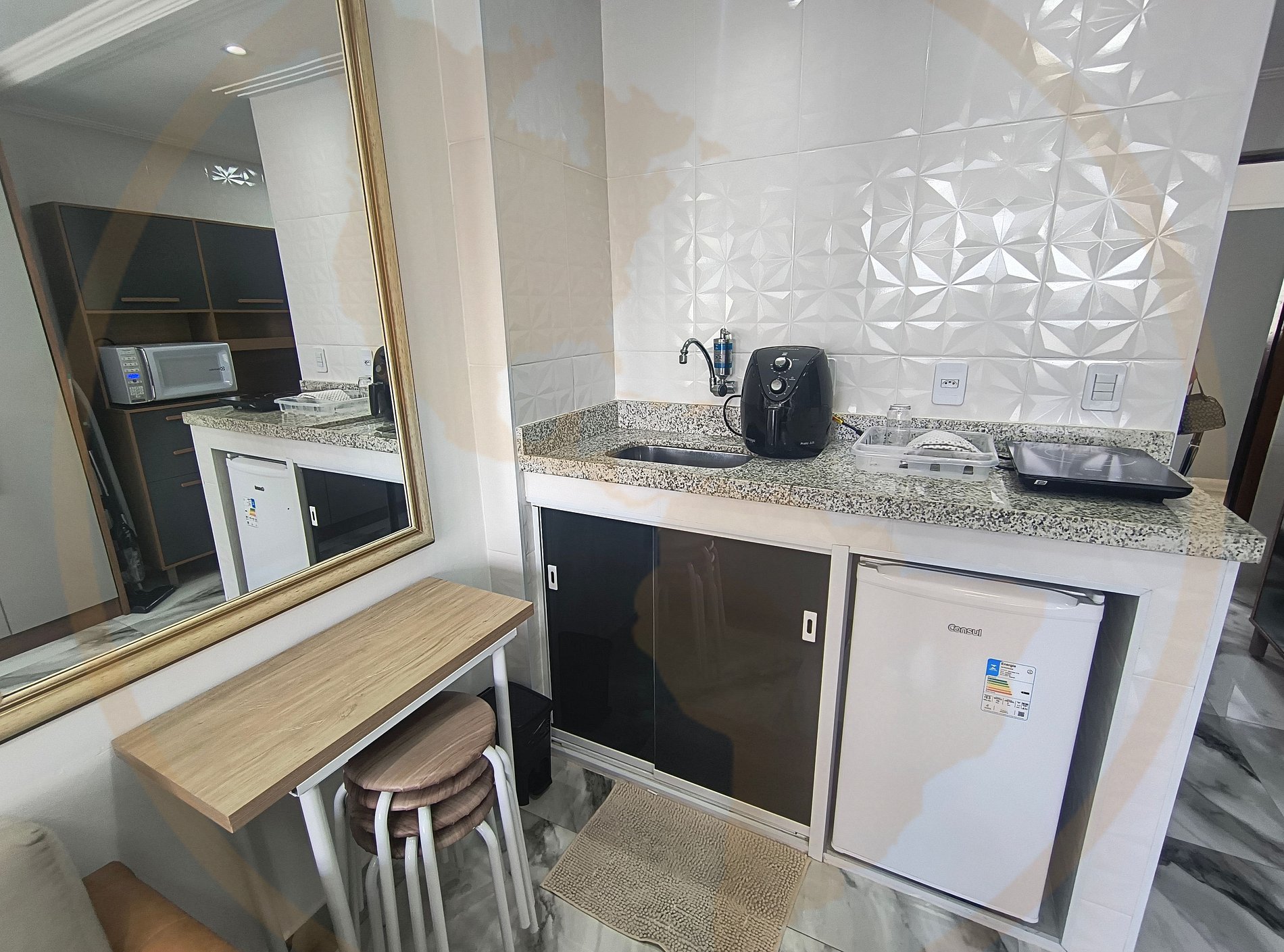 Cooktop de 01 boca, ar-condicionado, micro-ondas, cafeteira, liquidificador, sanduicheira, Air Fryer, panelas e demais utensílios de cozinha.