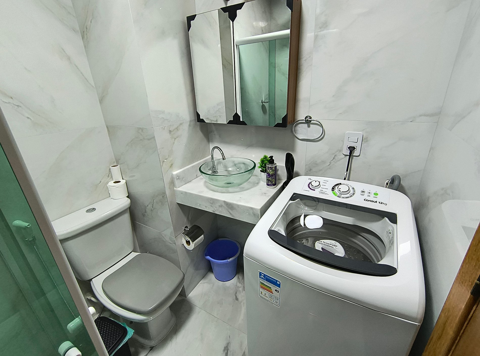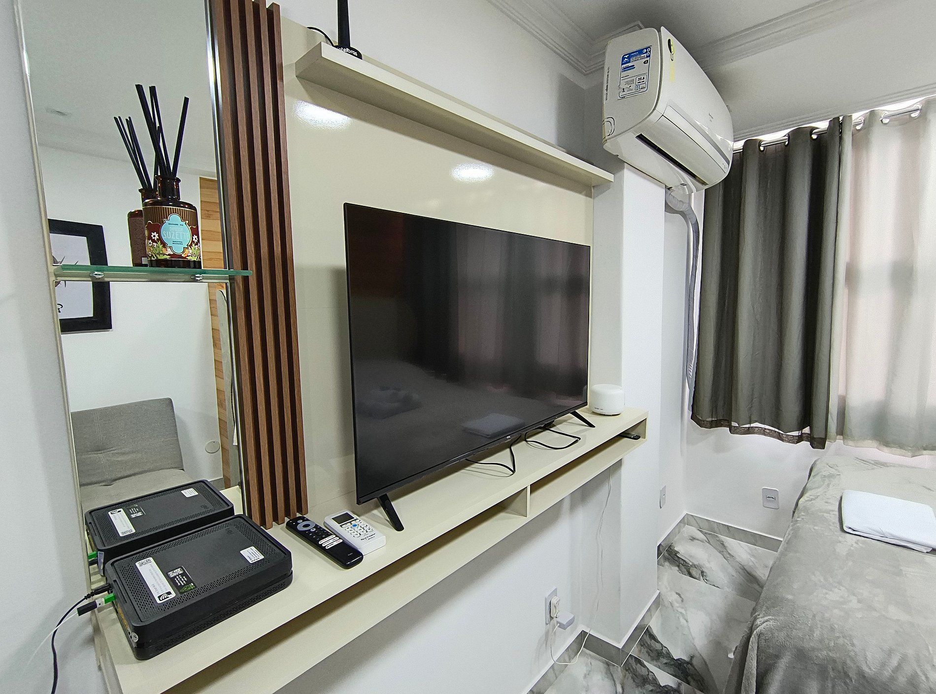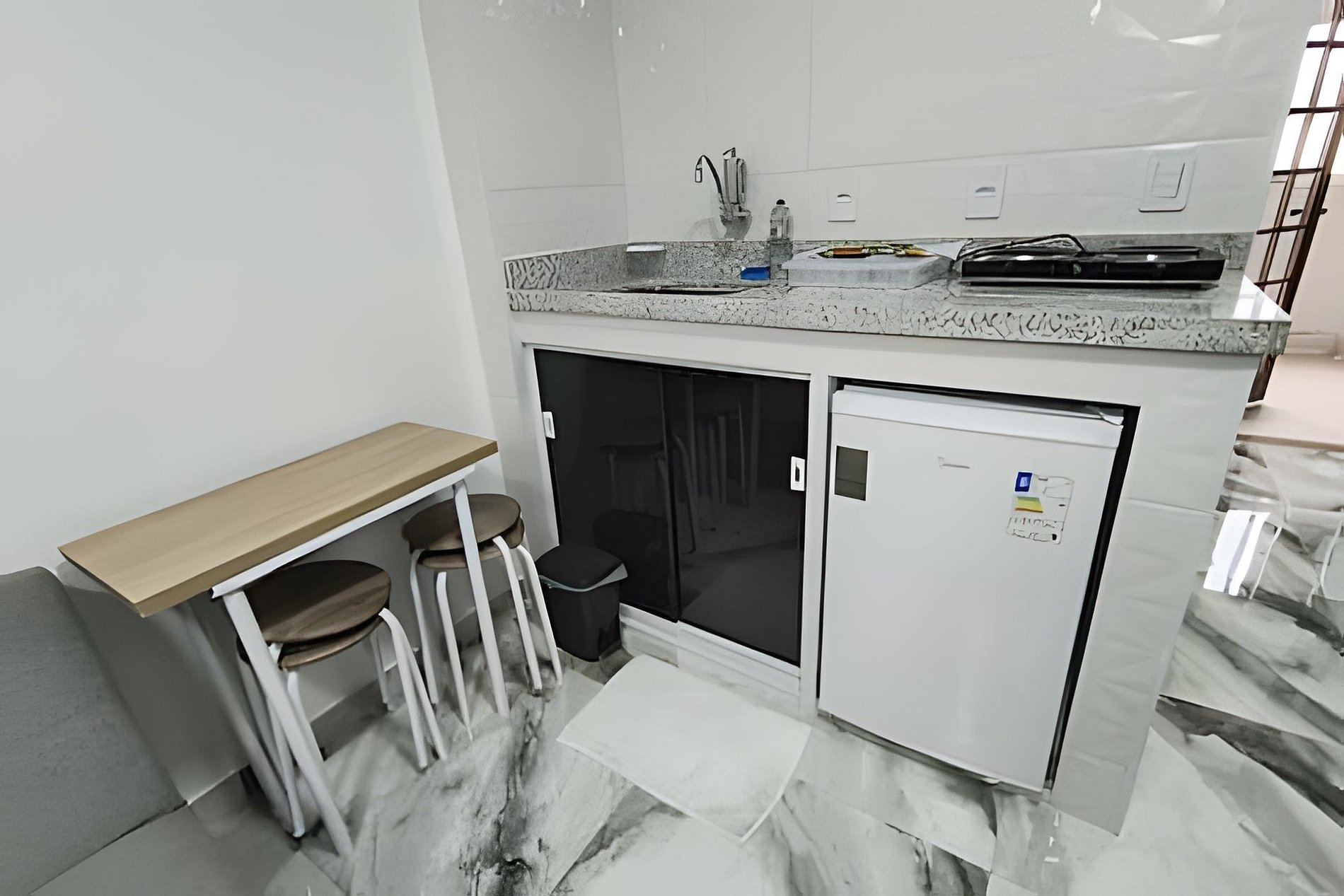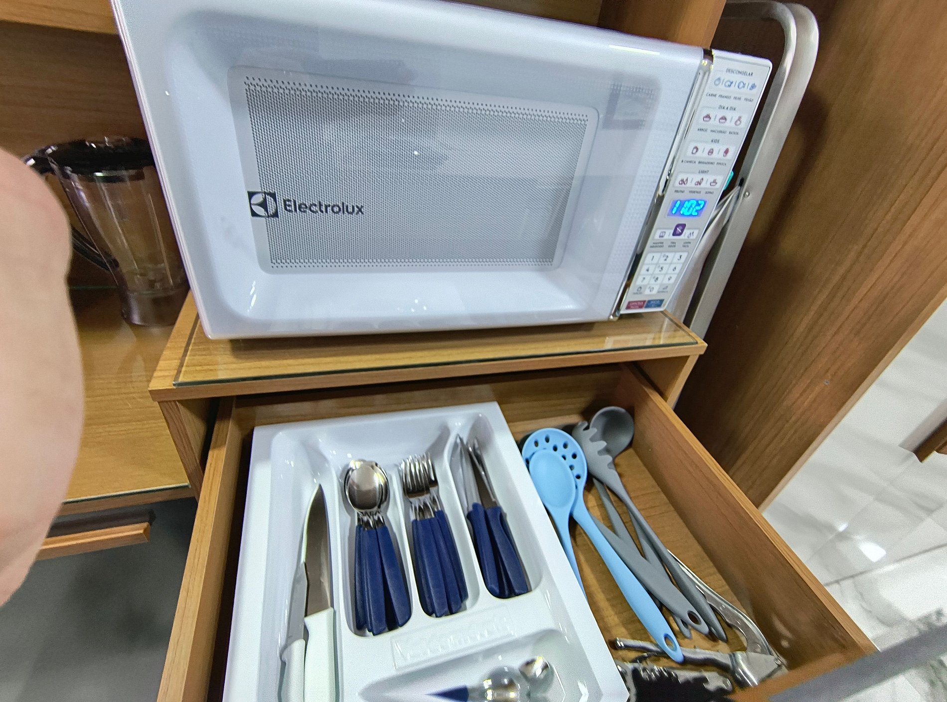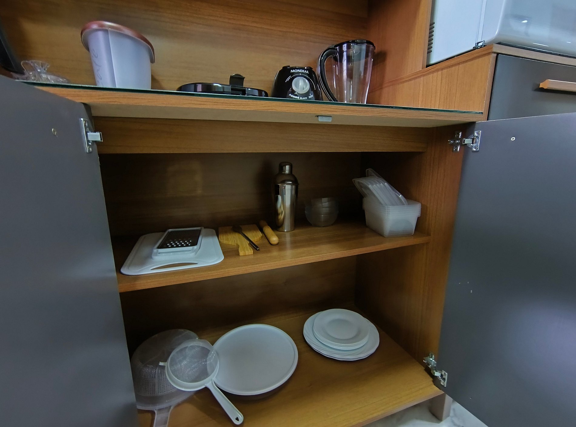 Cooktop de 01 boca, ar-condicionado, micro-ondas, cafeteira, liquidificador, sanduicheira, Air Fryer, panelas e demais utensílios de cozinha.