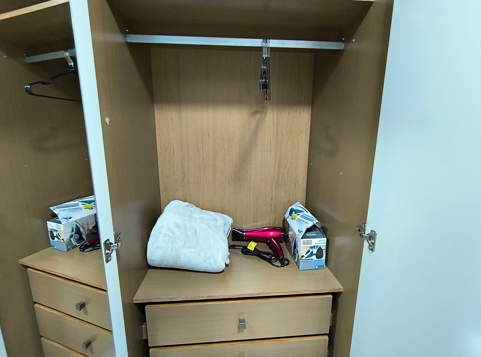 Guarda-roupa com cabides, máquina de lavar roupa e varal de parede, ferro e tábua de passar roupa, aspirador de pó e secador de cabelo.