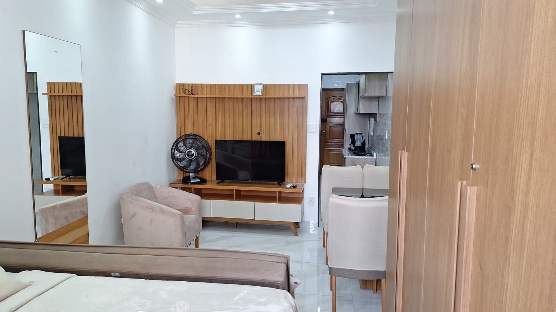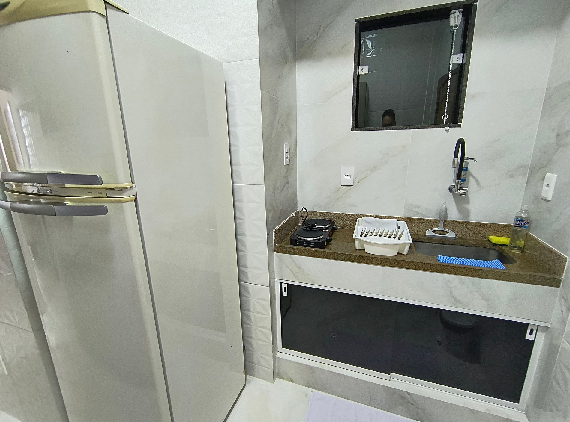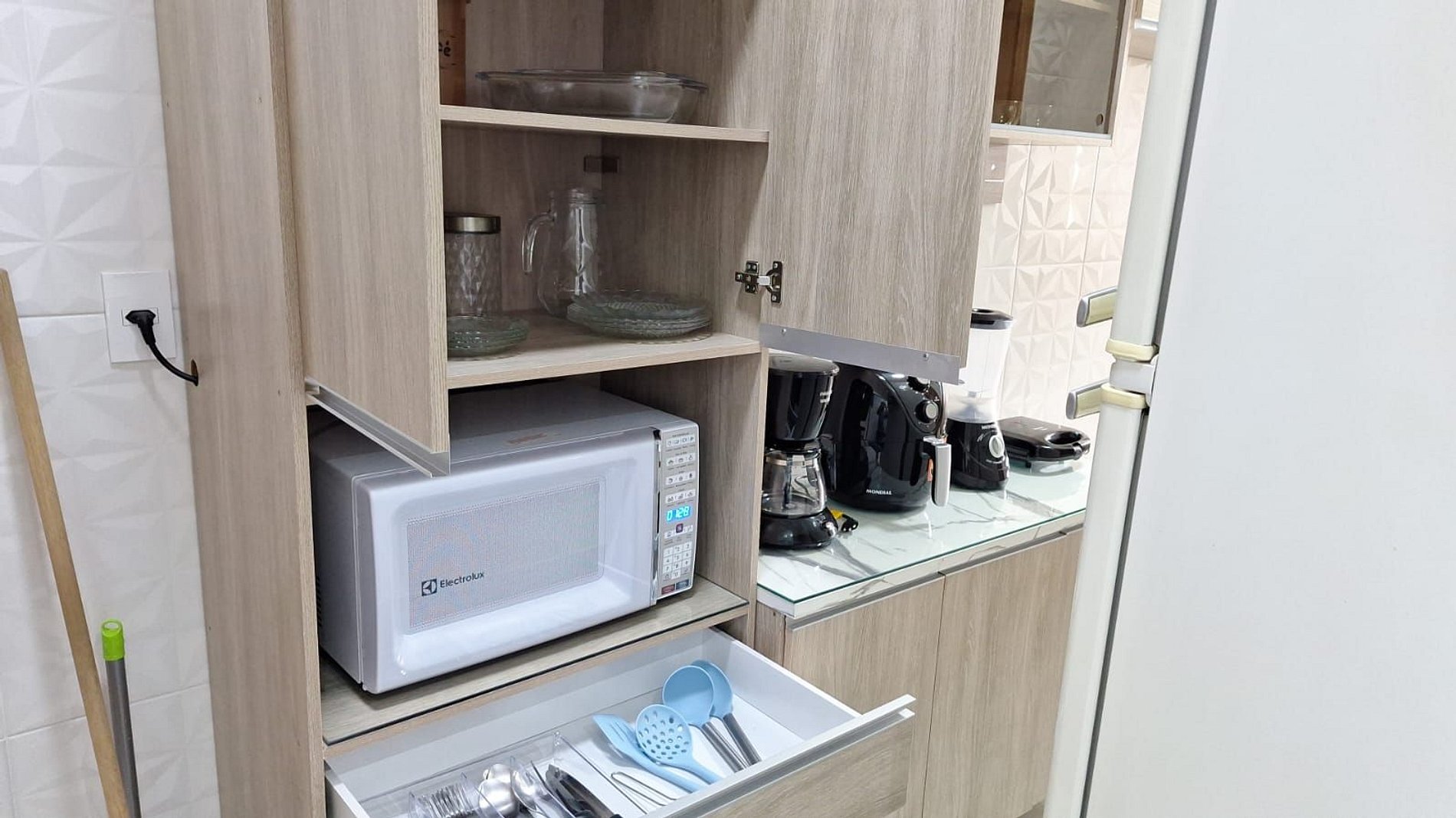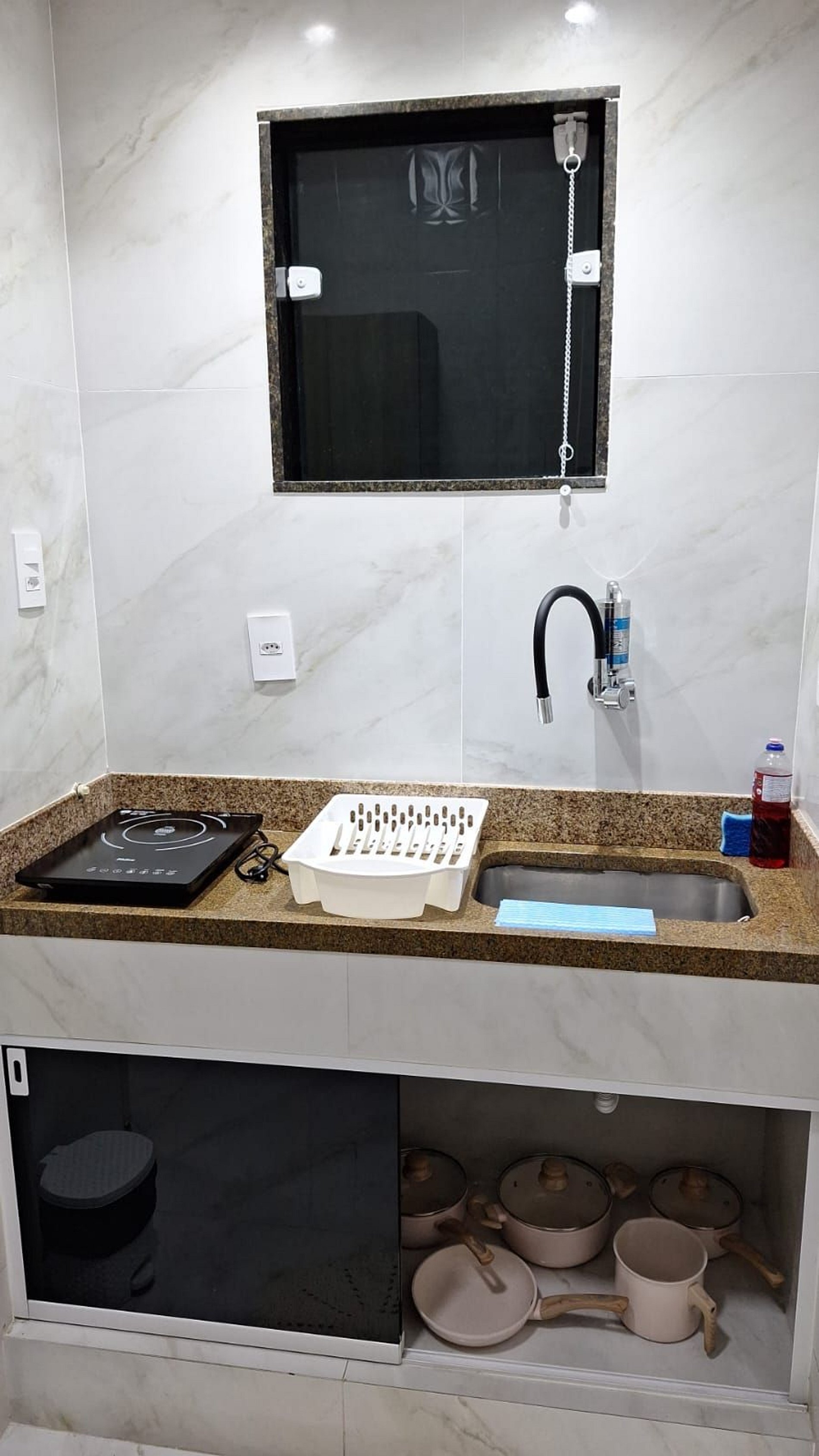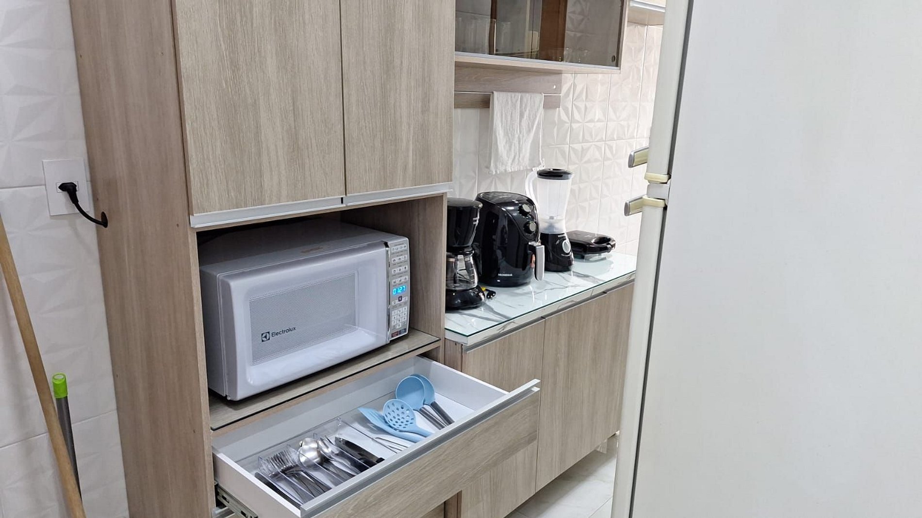 Cooktop de 01 boca, ar-condicionado, micro-ondas, cafeteira, liquidificador, sanduicheira, Air Fryer, panelas e demais utensílios de cozinha.