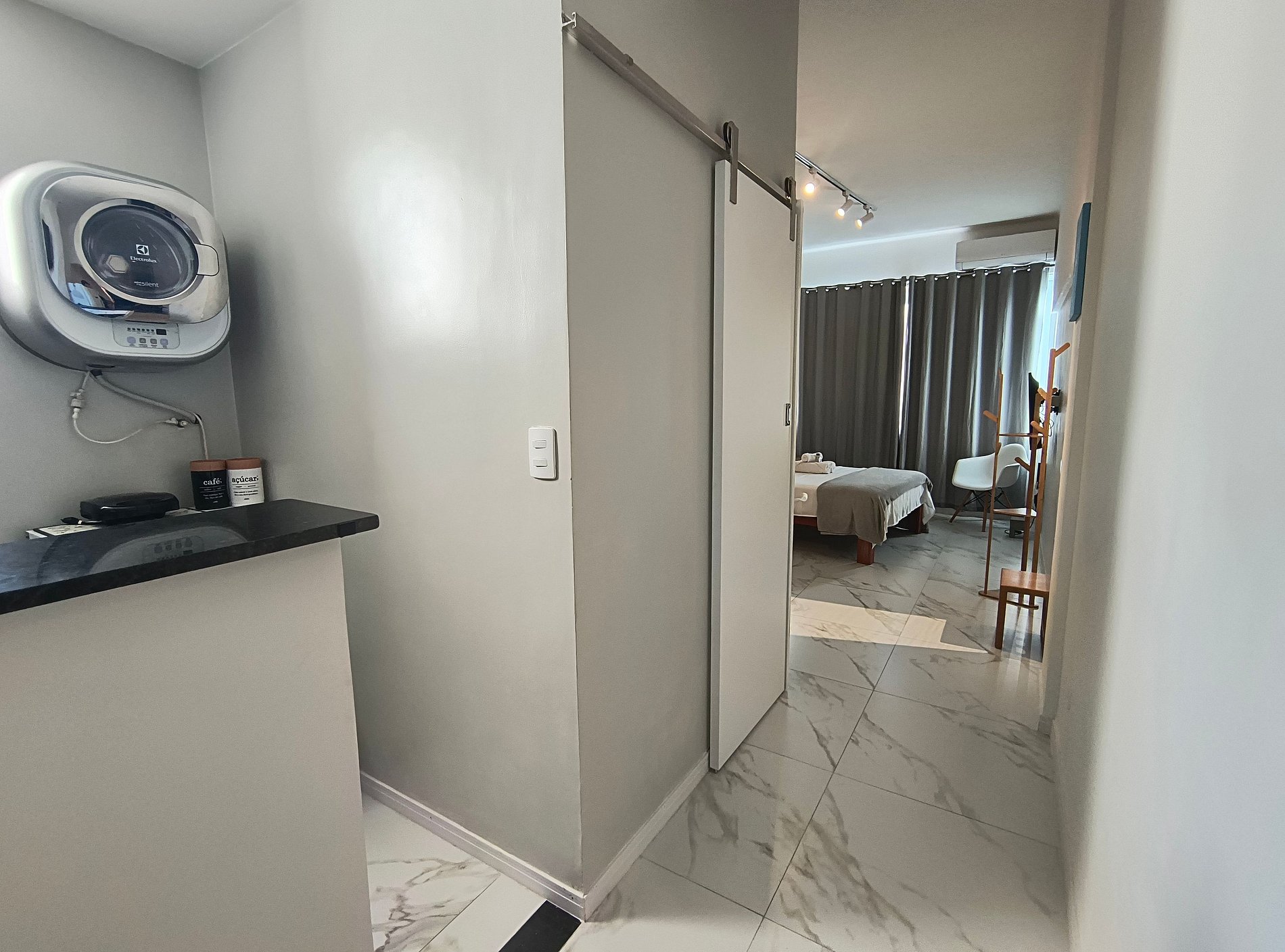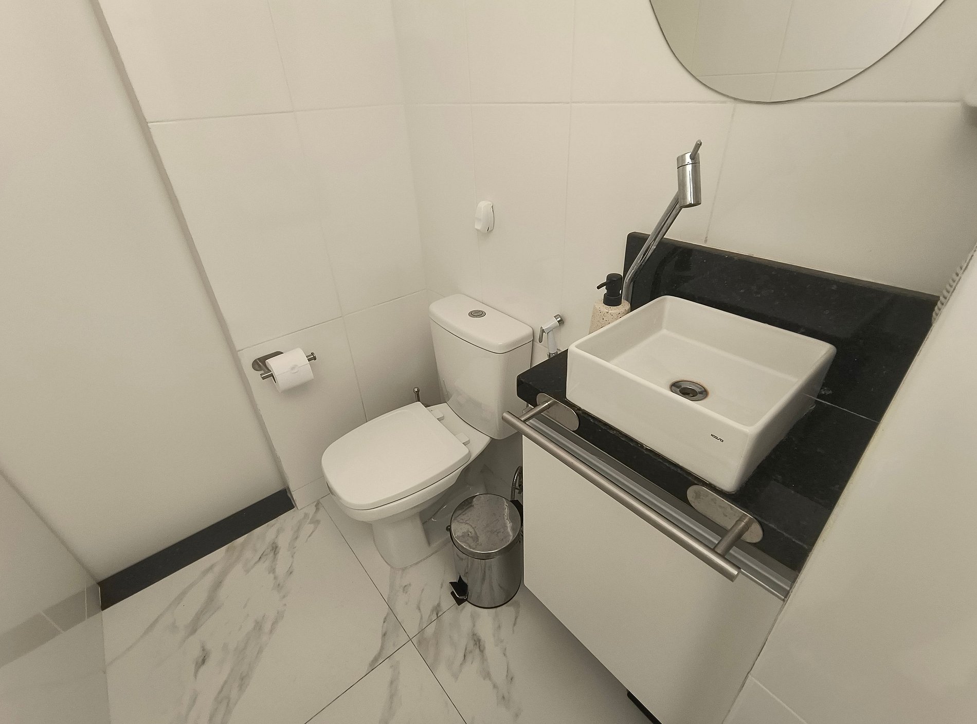 Banheiro espaçoso, com água quente e secador de cabelo. Fechadura eletrônica para entrada no apartamento, garantindo praticidade e privacidade.