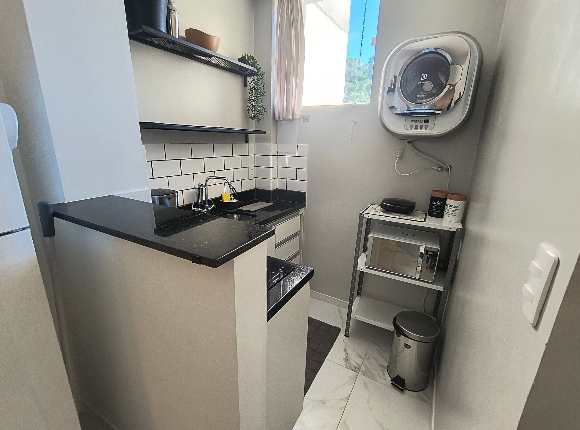 Possui uma pequena máquina de lavar e secar roupas.