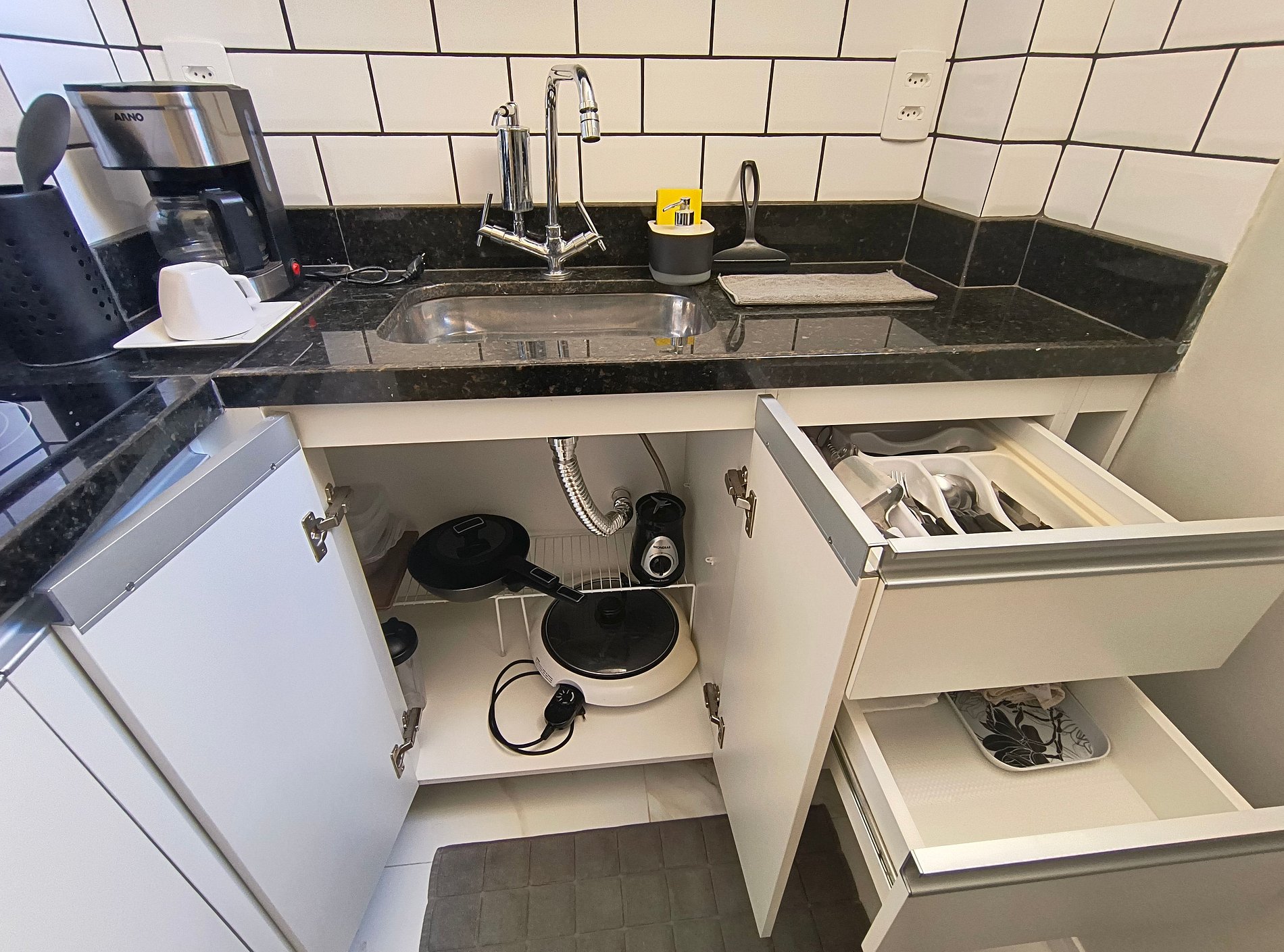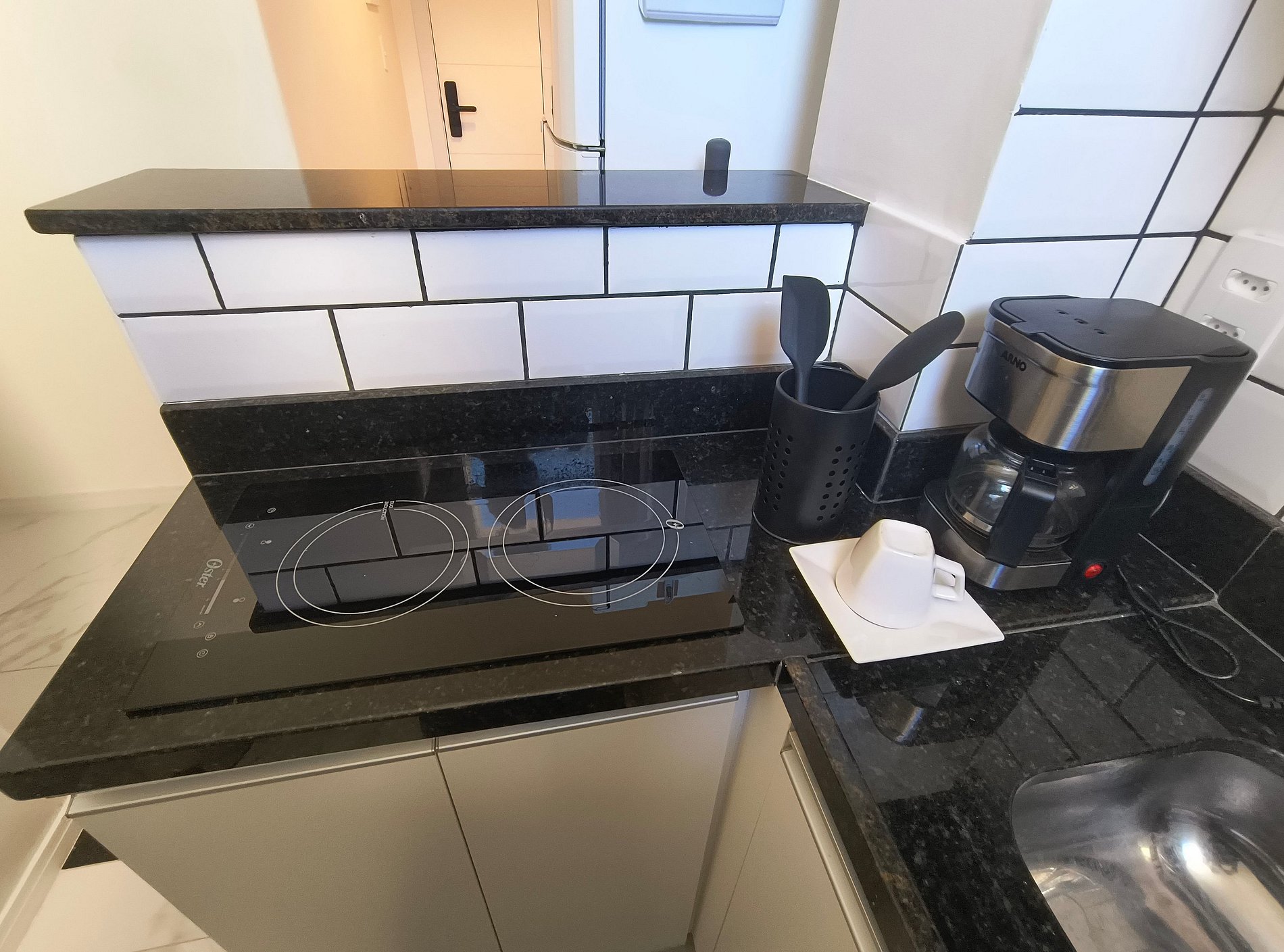 Cozinha com geladeira, cooktop, microondas, cafeteira, liquidificador, sanduicheira e demais utensílios domésticos para o preparo de refeições rápidas.