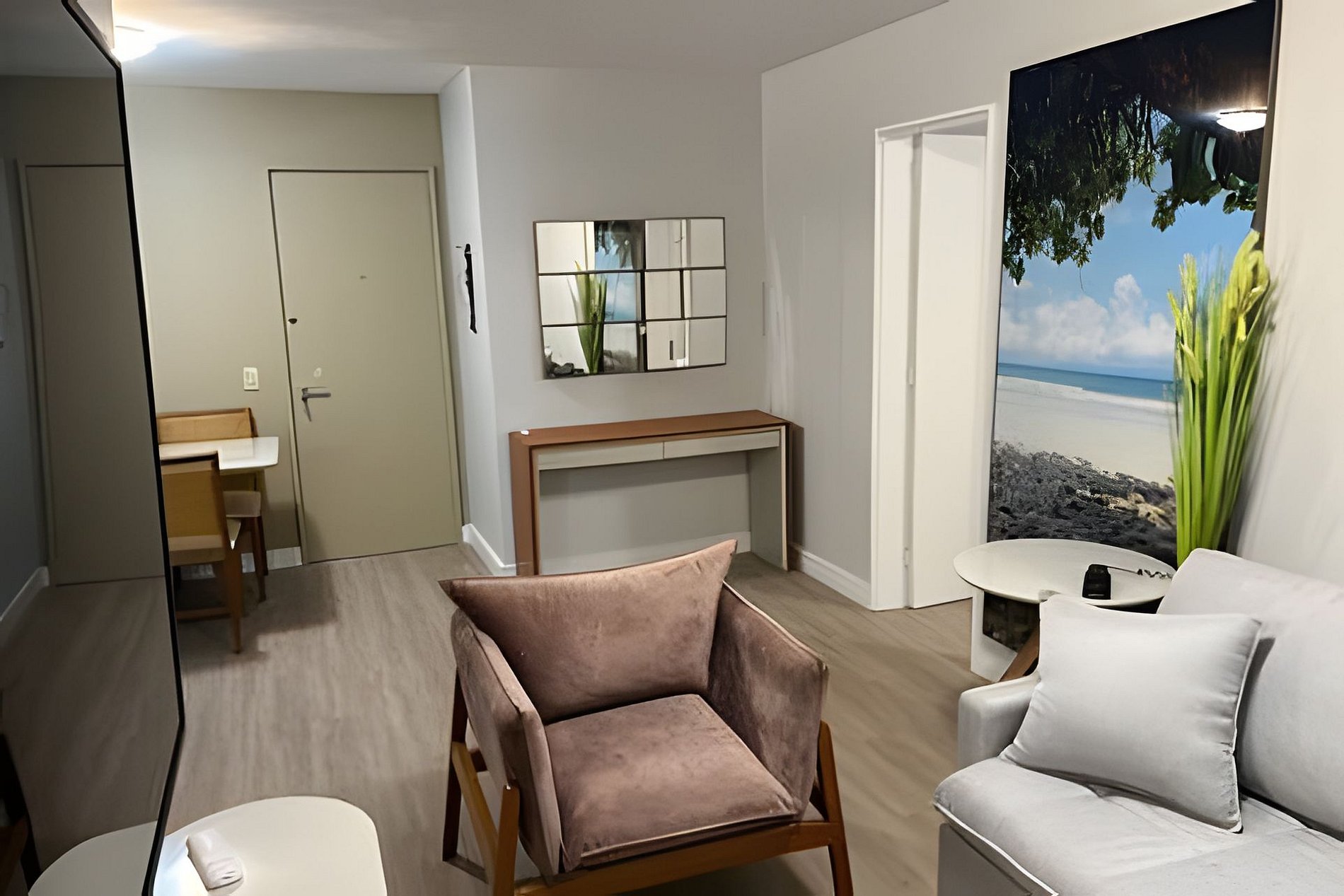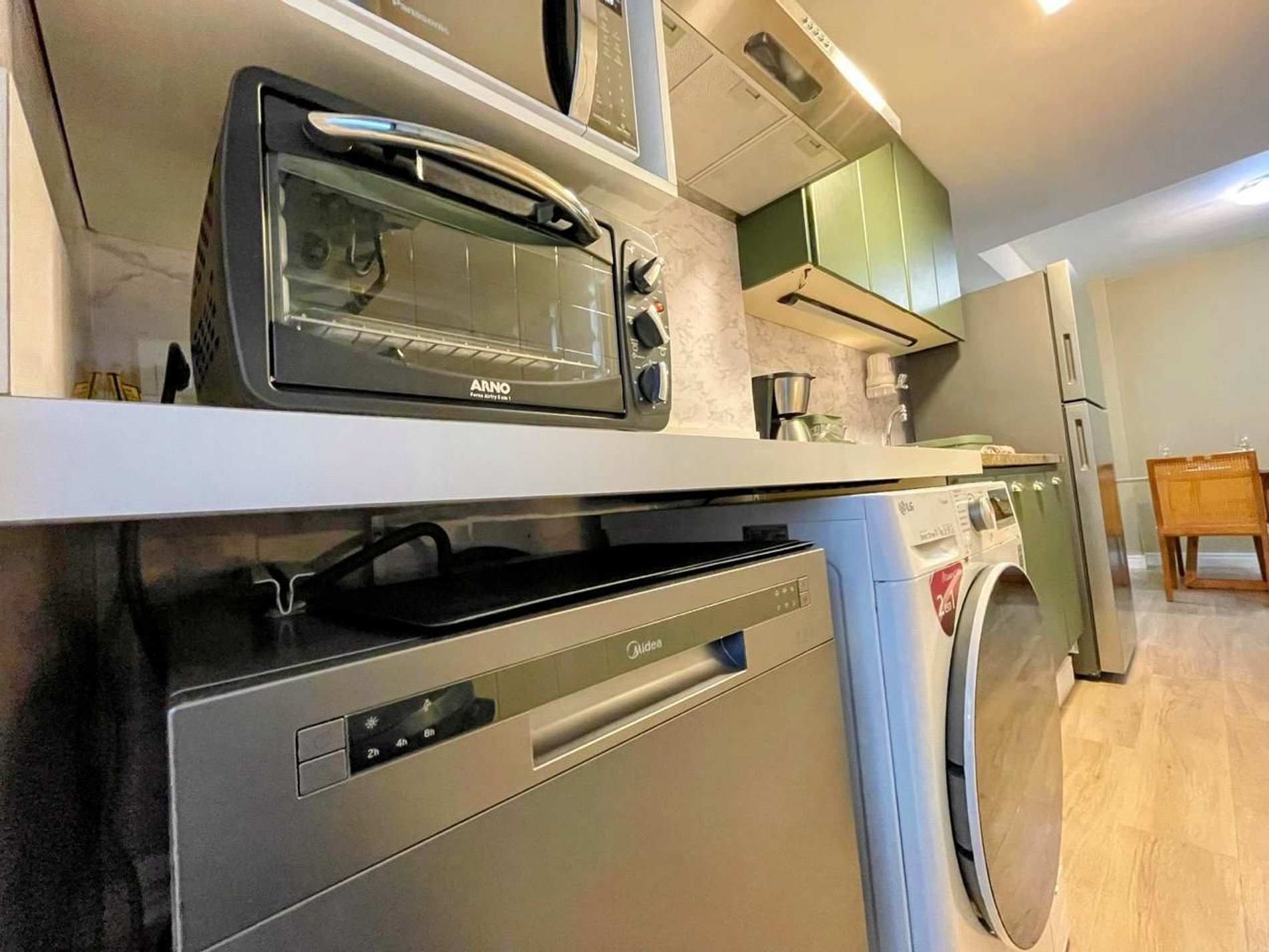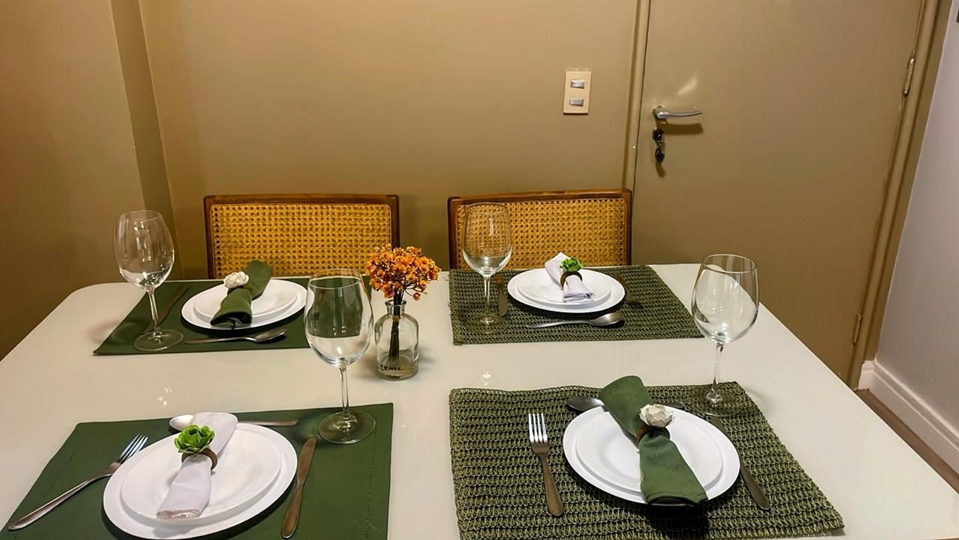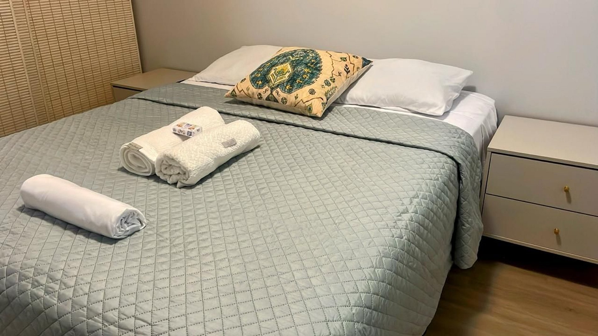 Possui 2 quartos(1 suíte),2 banheiros,cozinha completa,ar-condicionado em todos os cômodos,máquina de lavar e secar roupas e WI-FI.