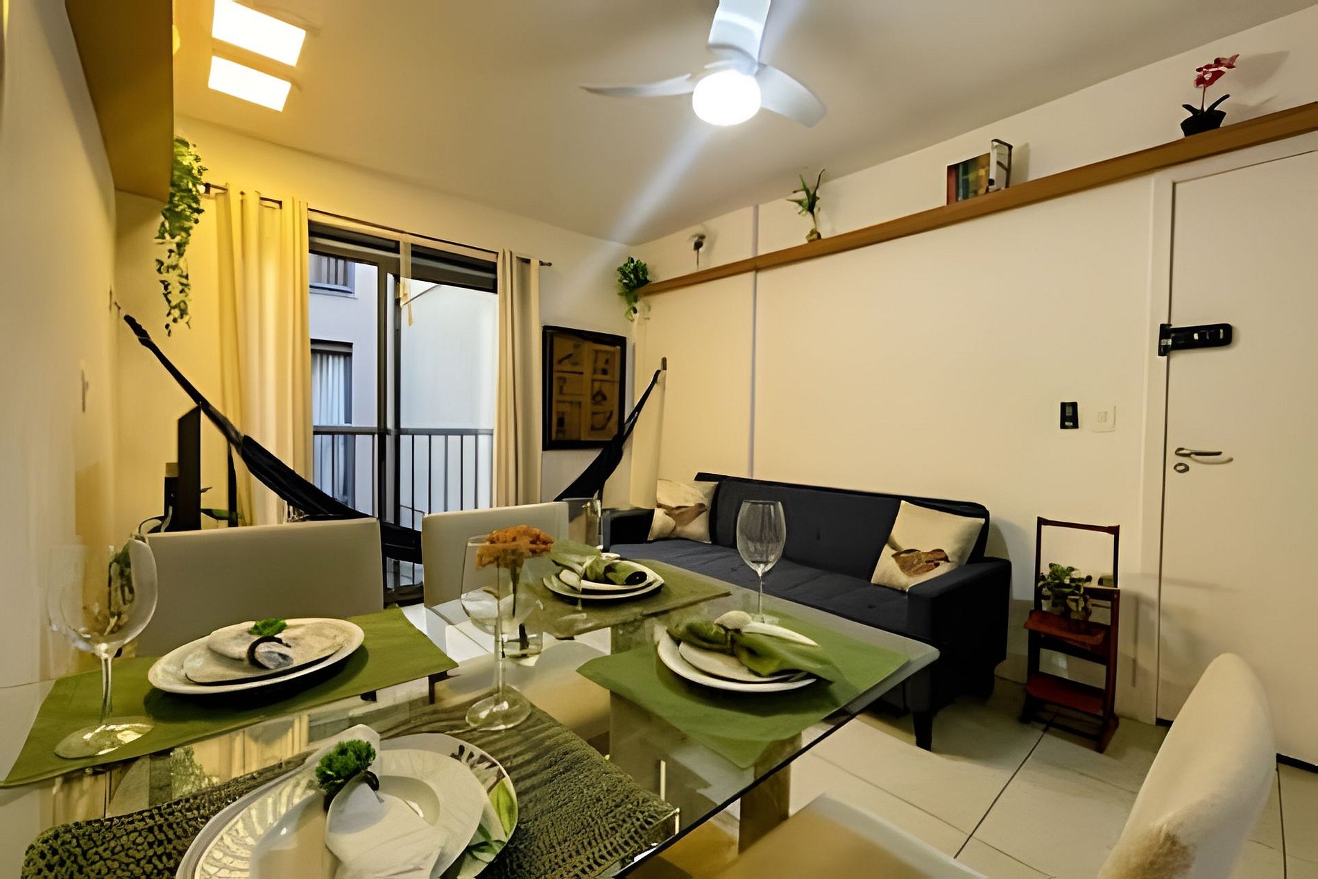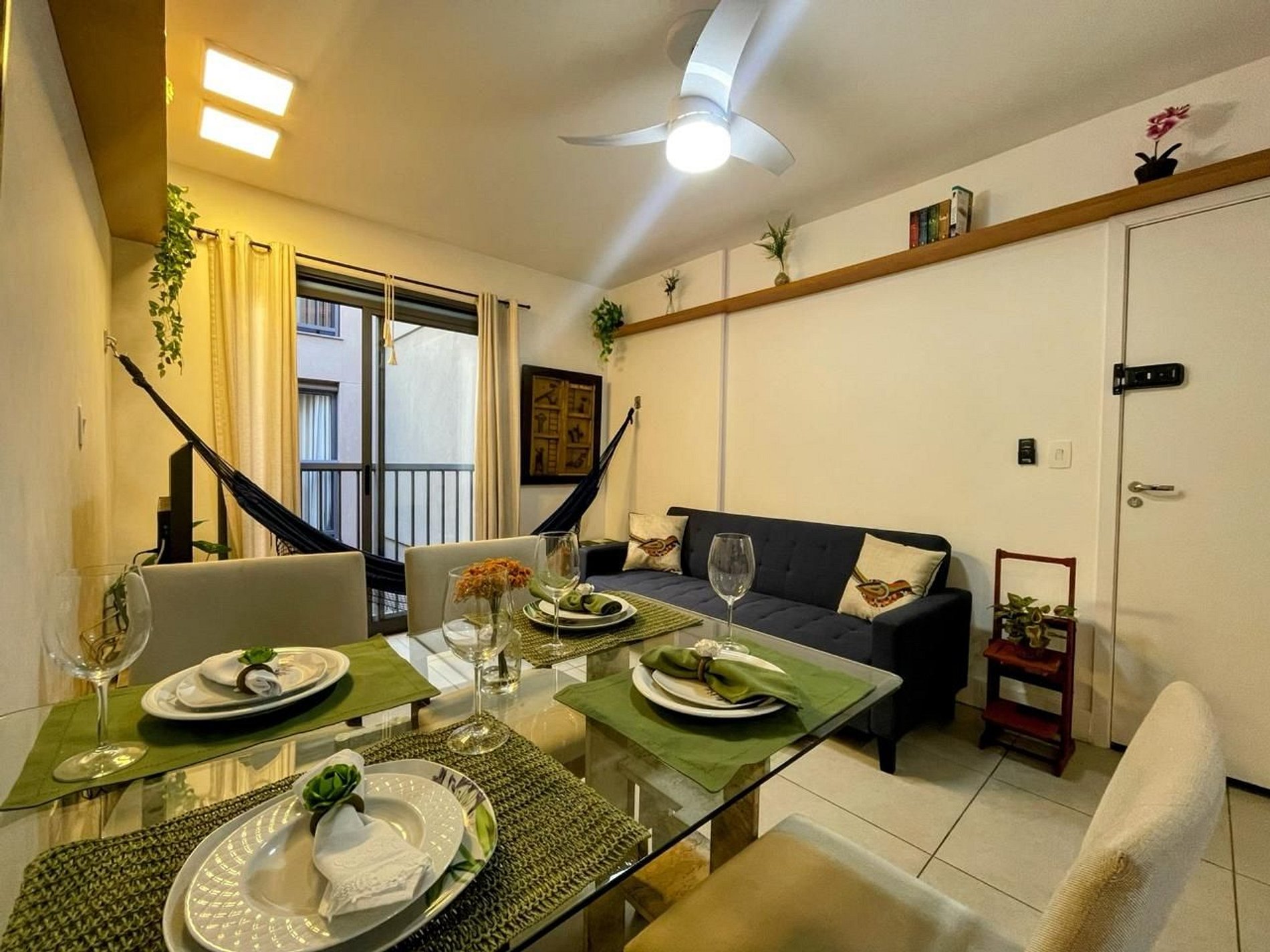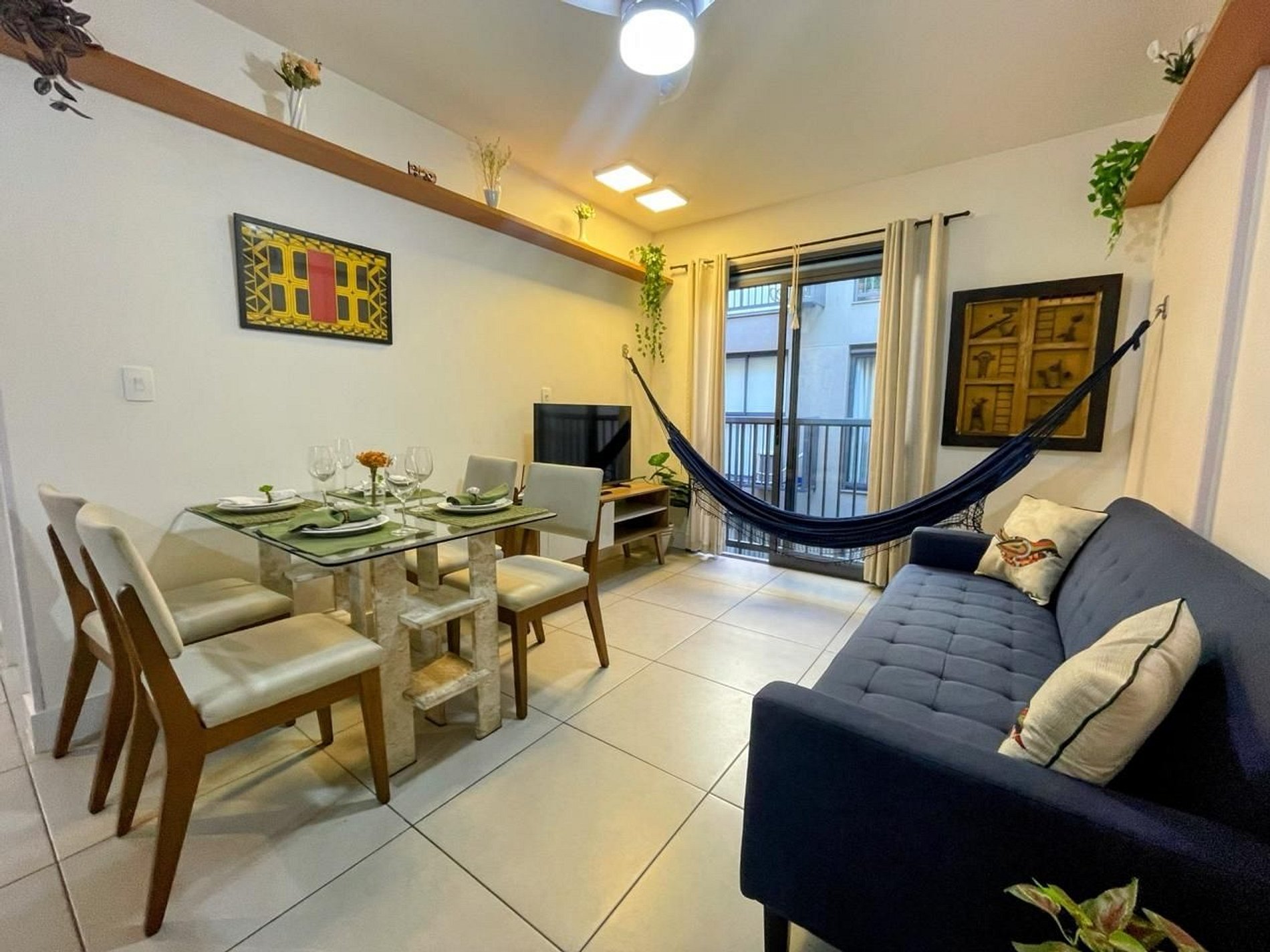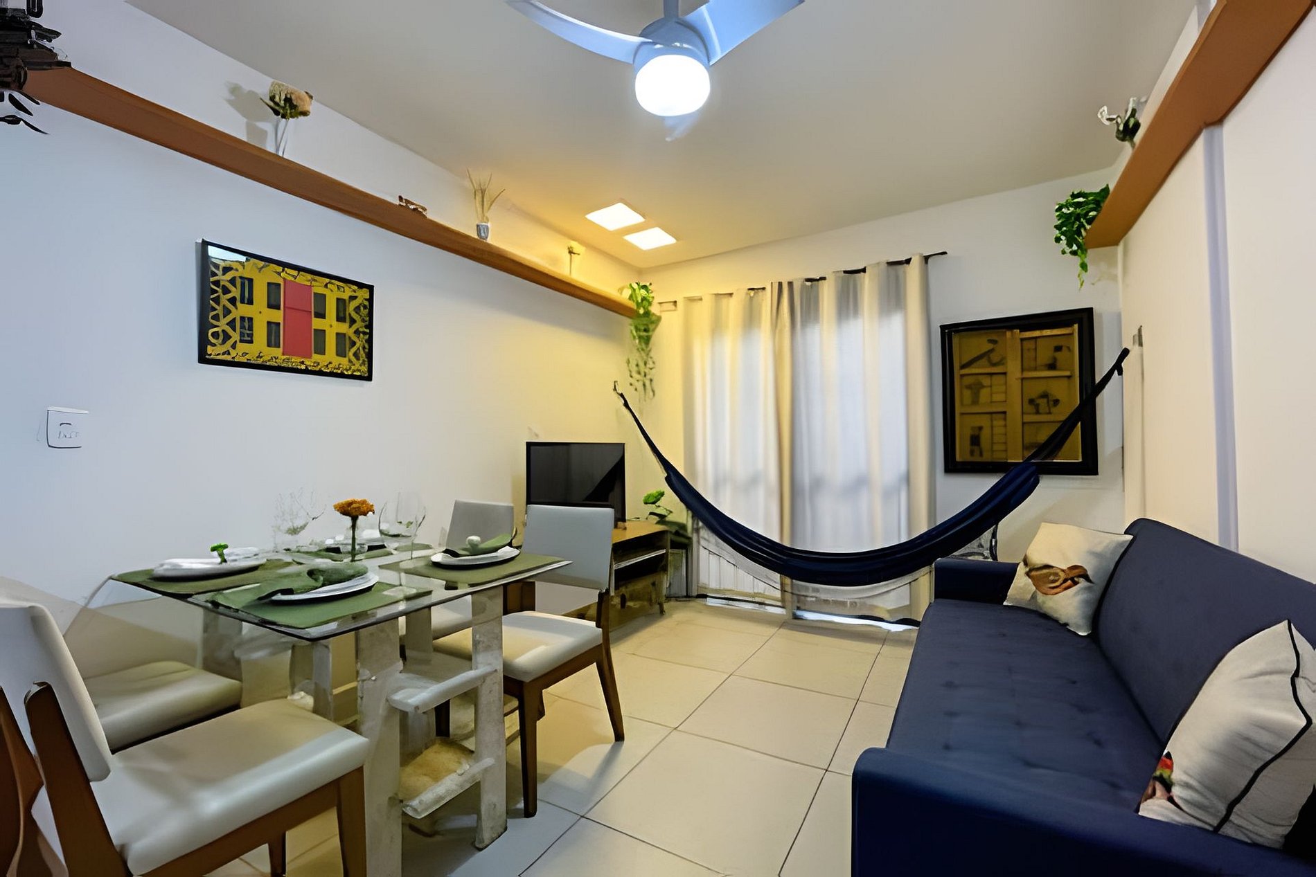 Sala com mesa com 4 cadeiras, ventilador de teto, Smart TV e 01 sofá-cama casal e cortina.