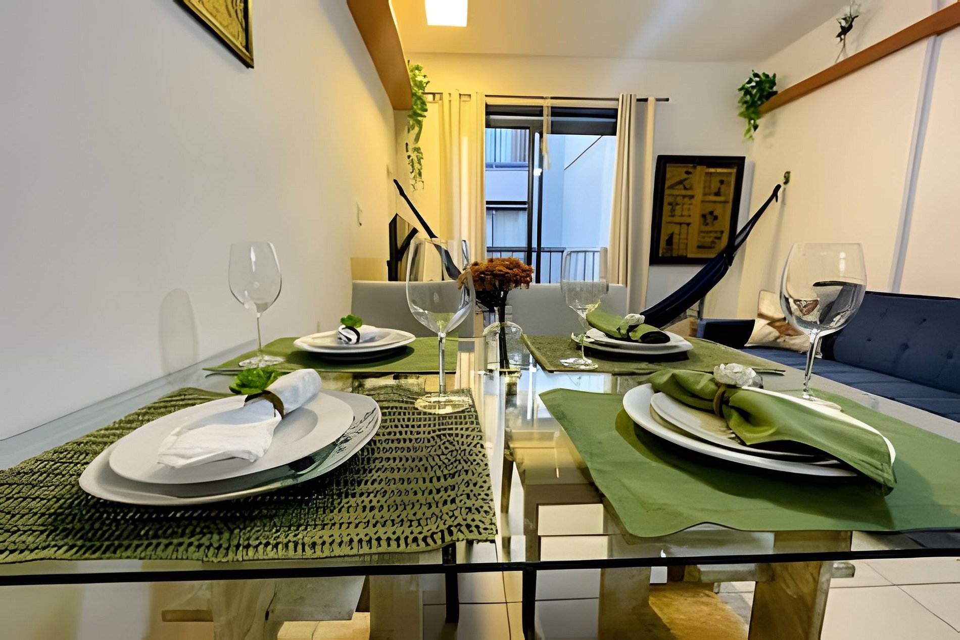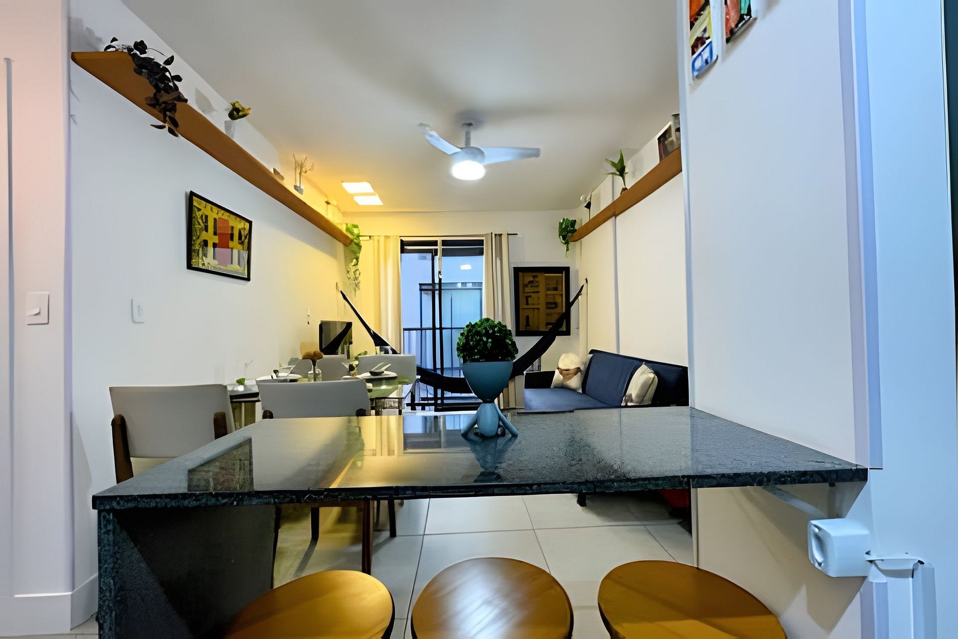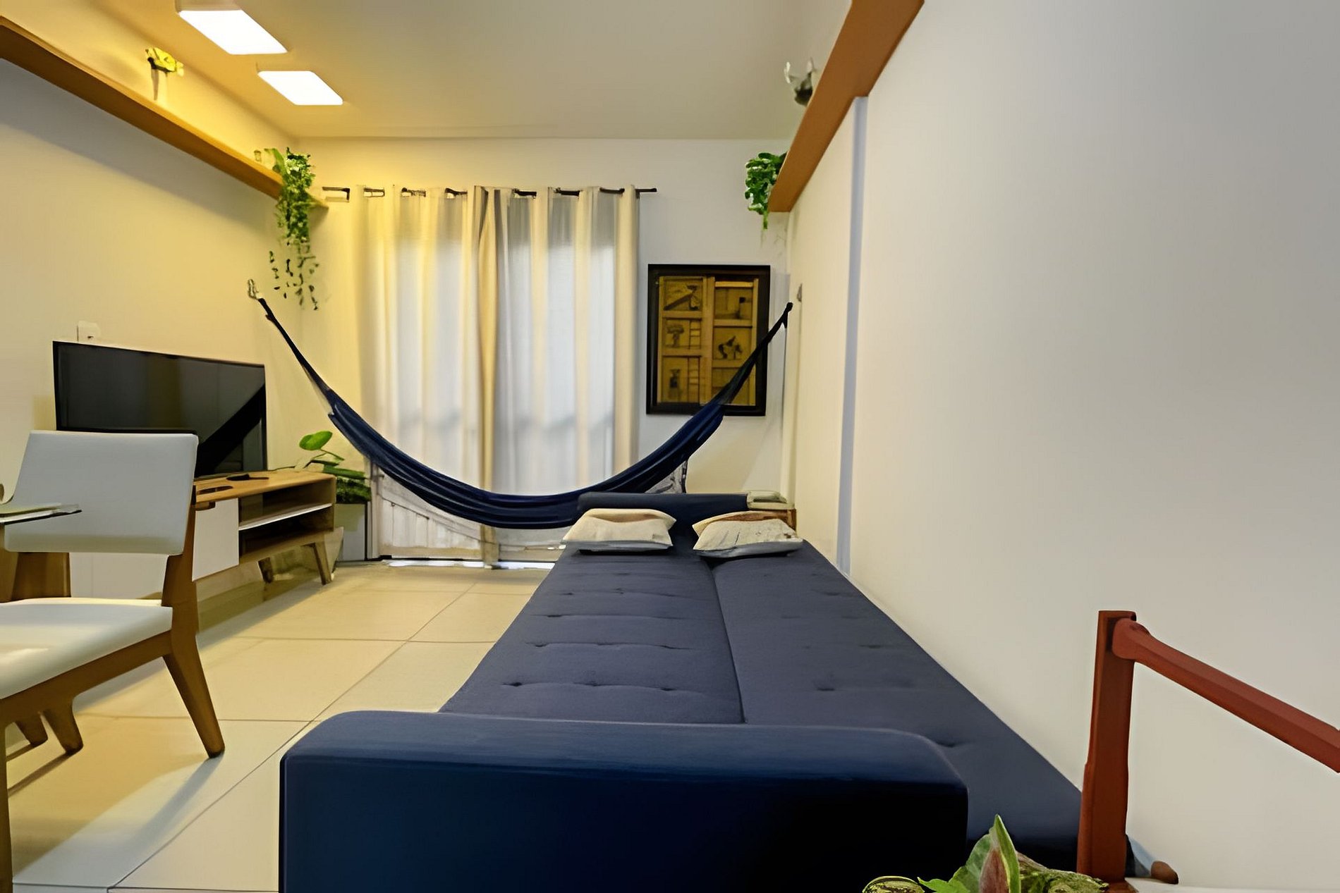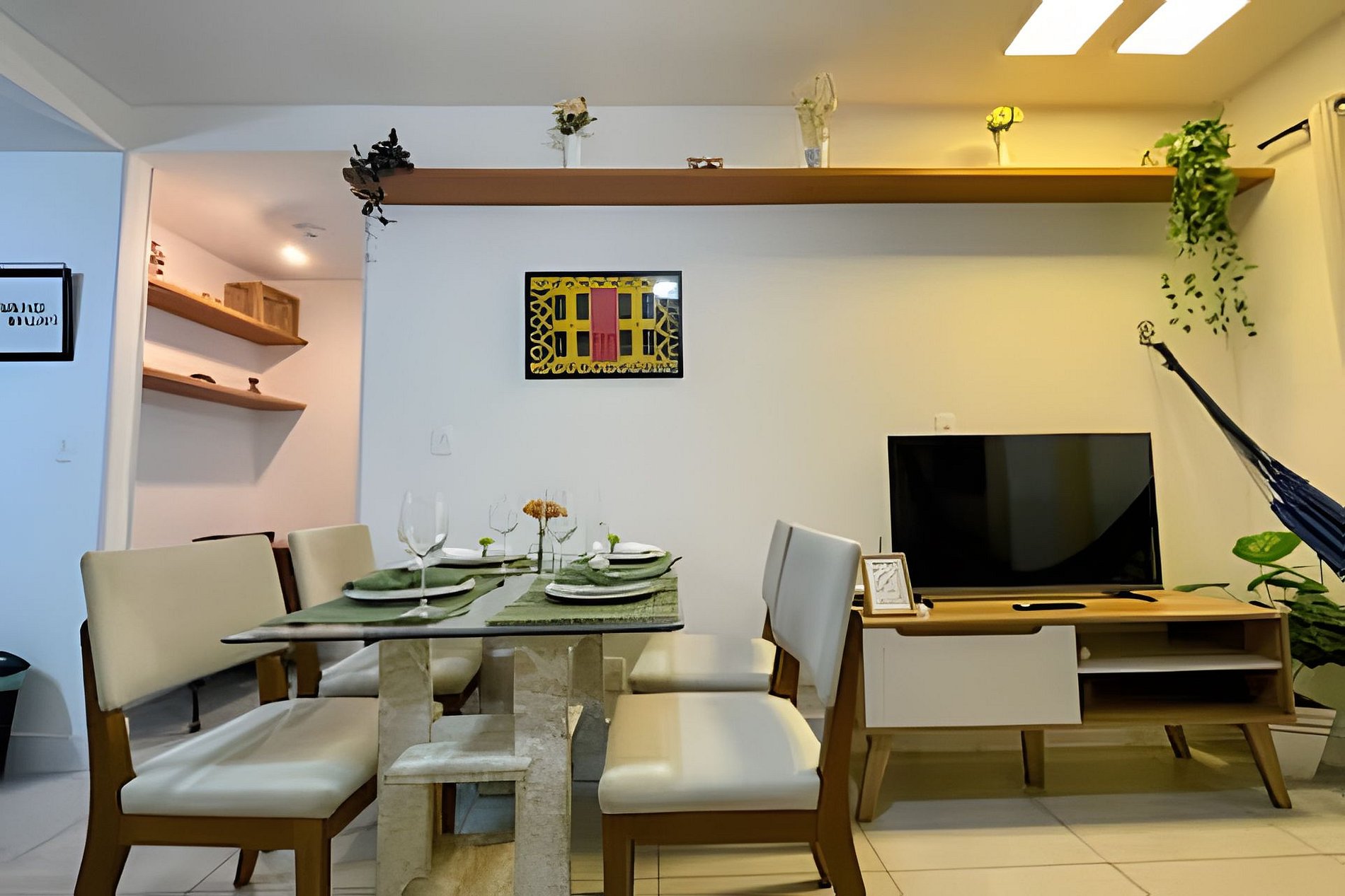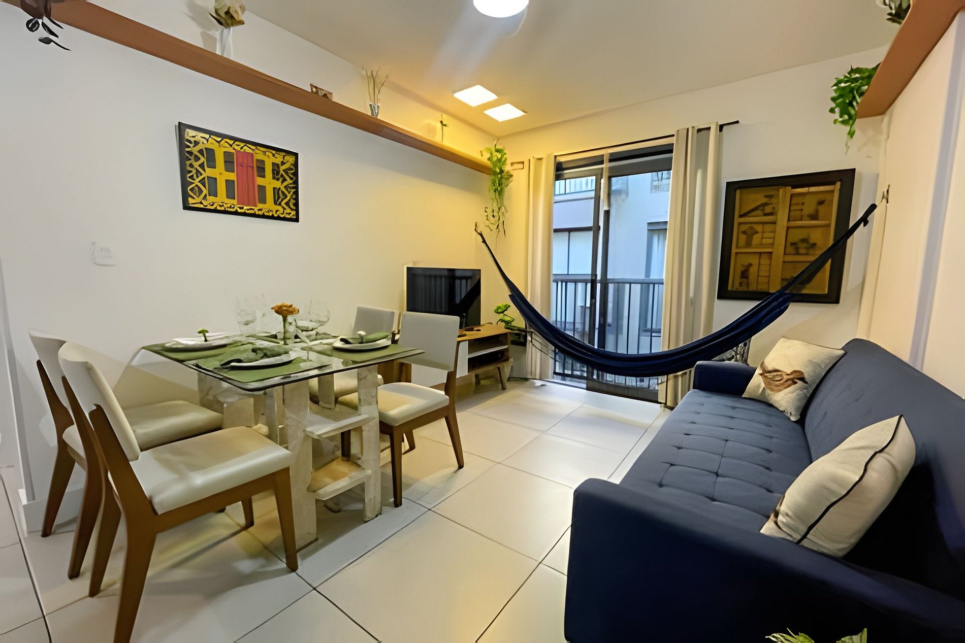 Sala com mesa com 4 cadeiras, ventilador de teto, Smart TV e 01 sofá-cama casal e cortina.