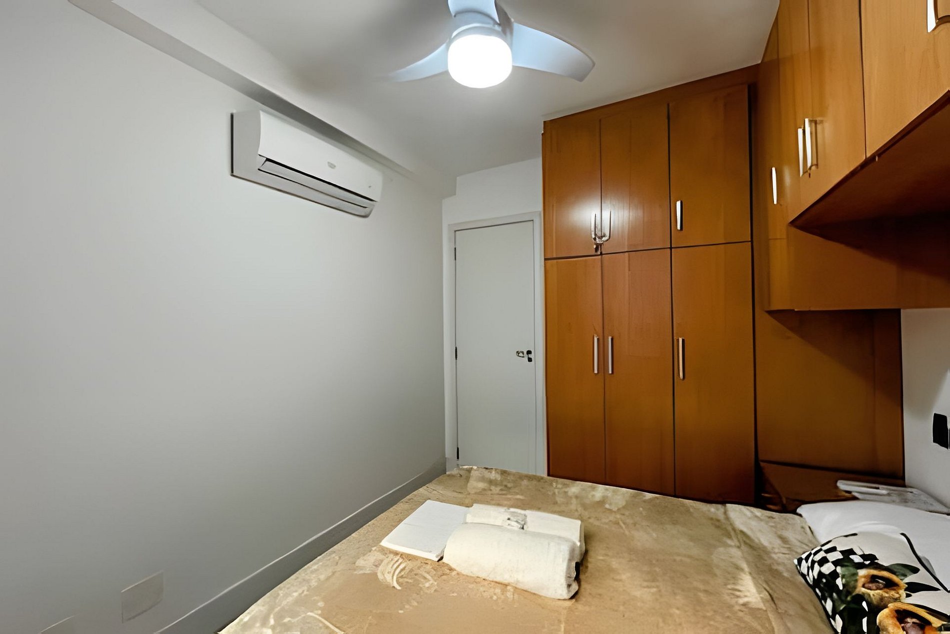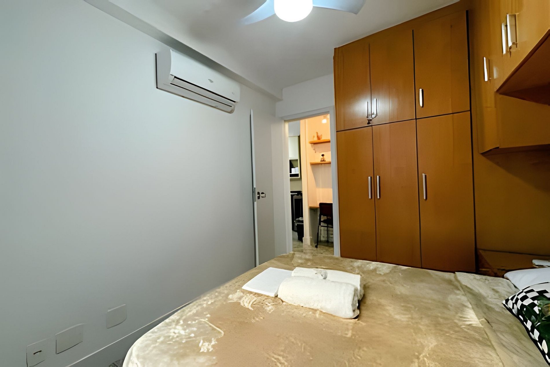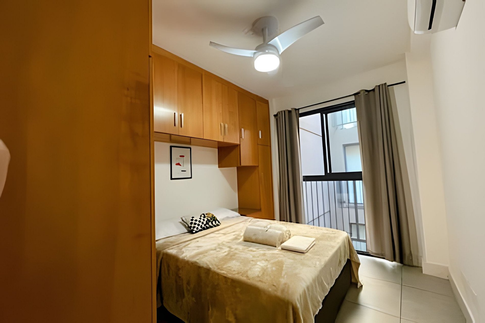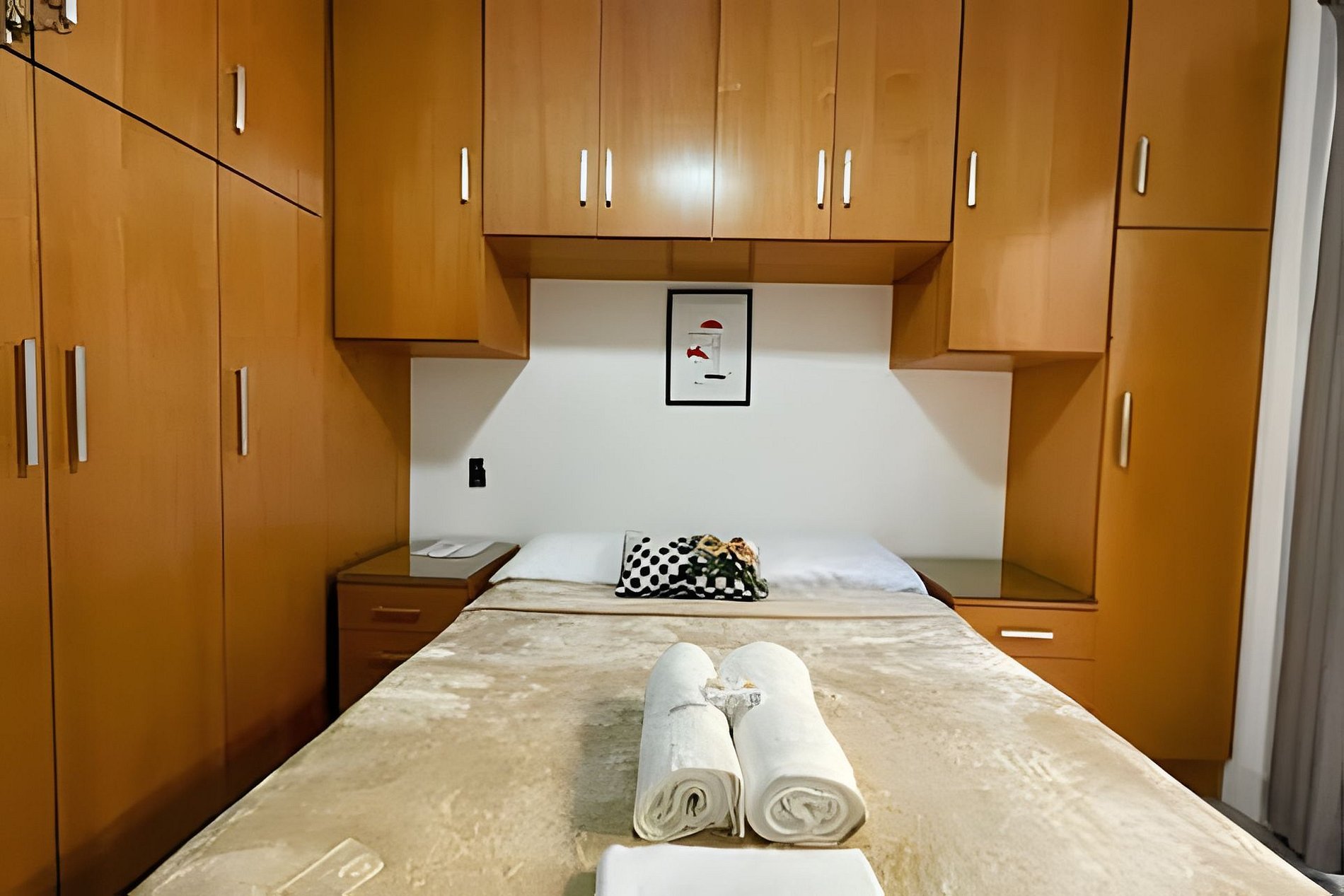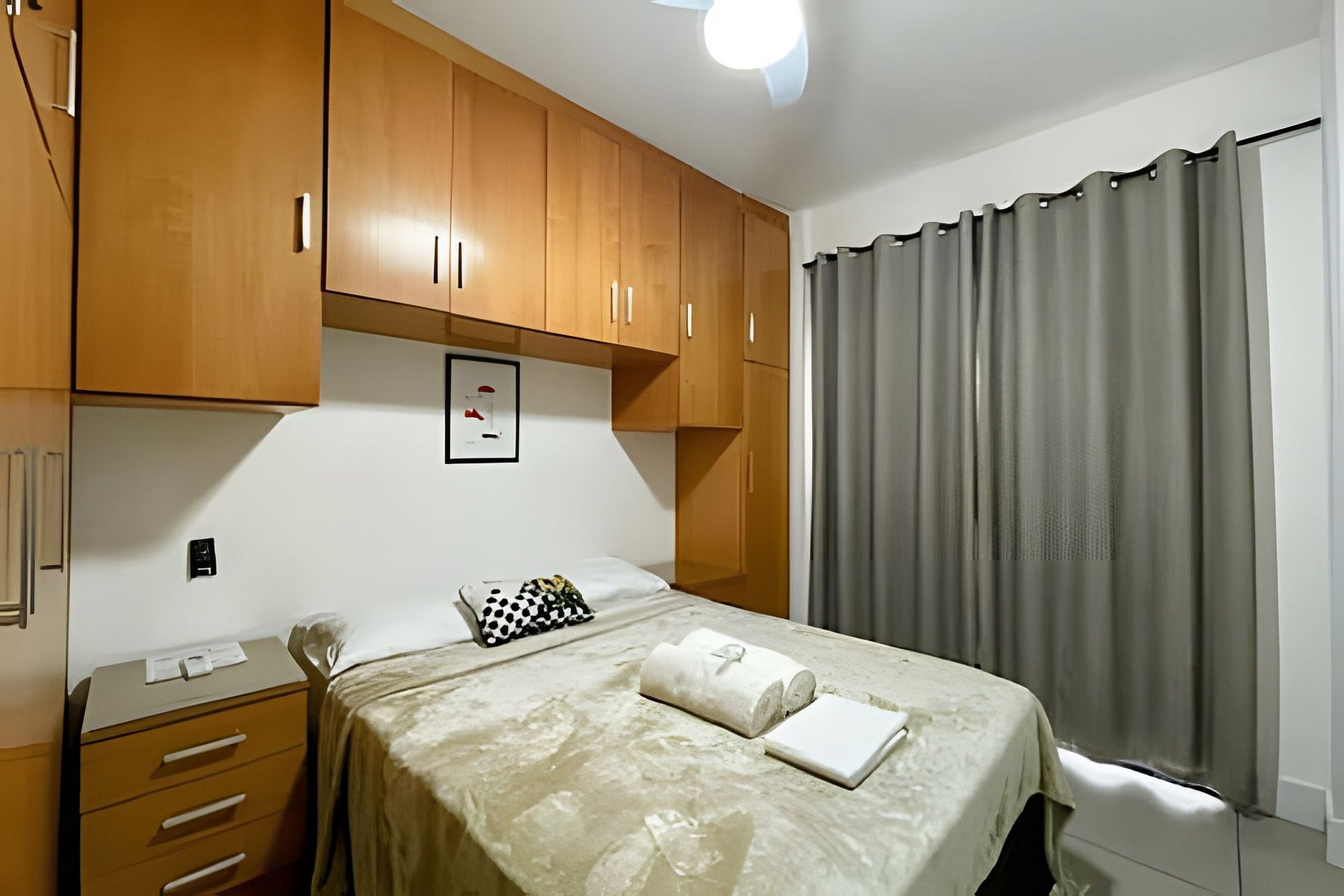 Equipado com 01 quarto com 01 cama de casal, ar-condicionado split e também ventilador de teto e grande roupeiro com cabides. Possui blackout na cortina, garantindo uma noite de sono tranquila e confortável.