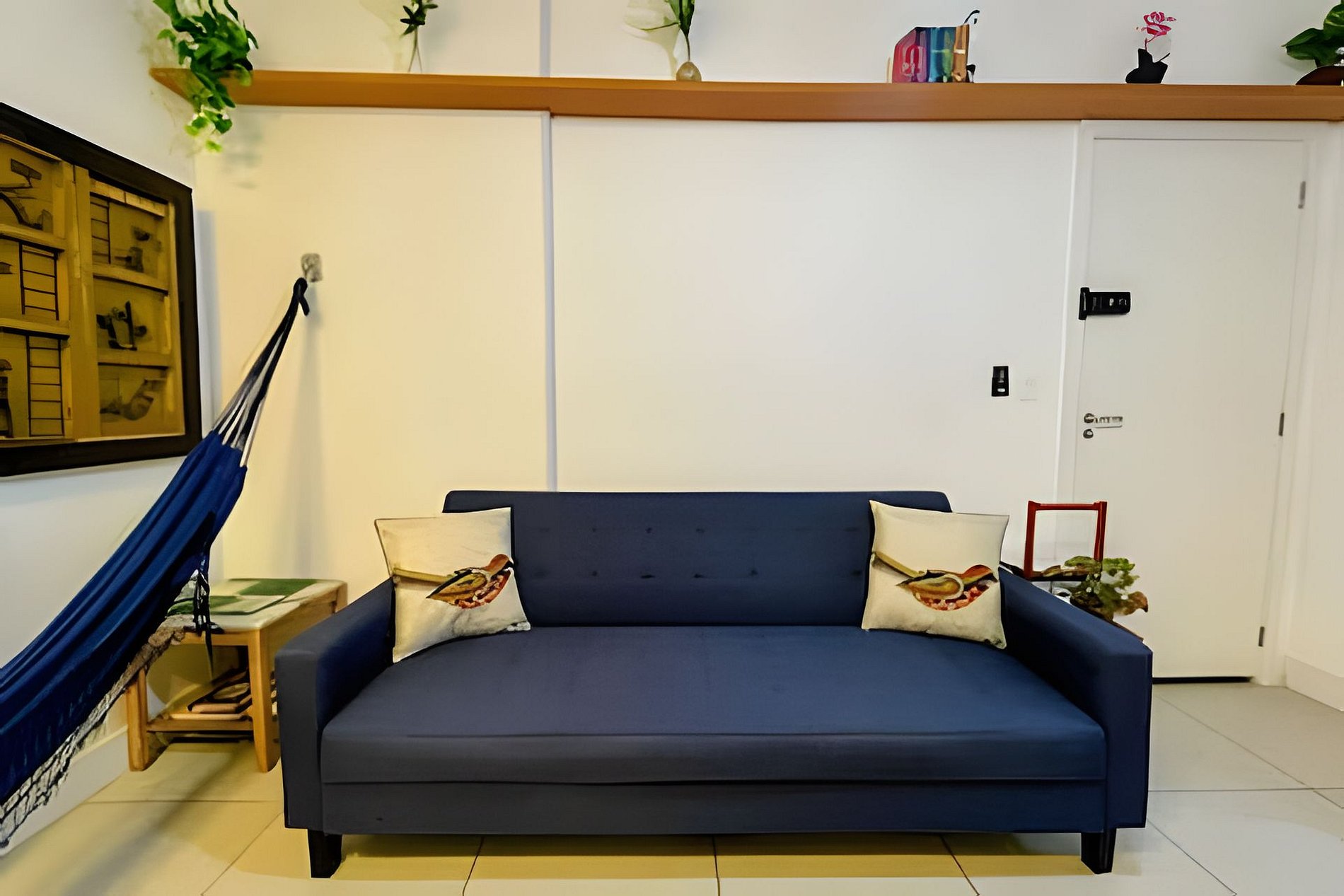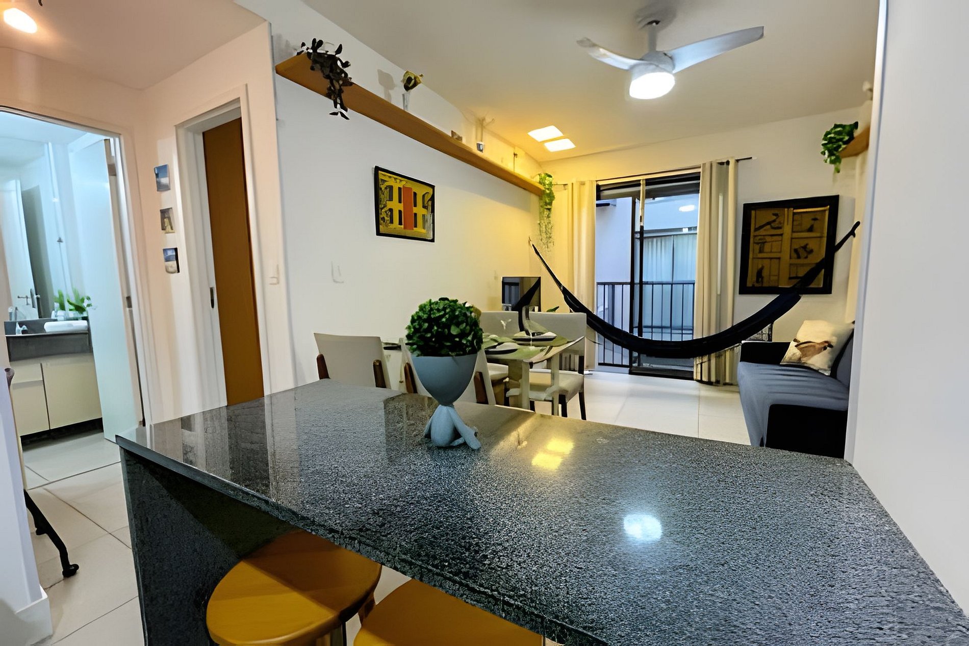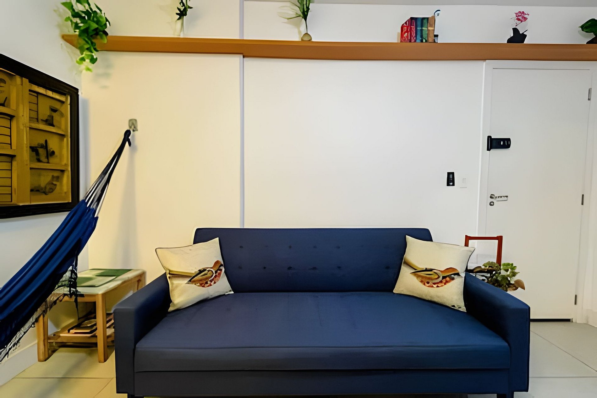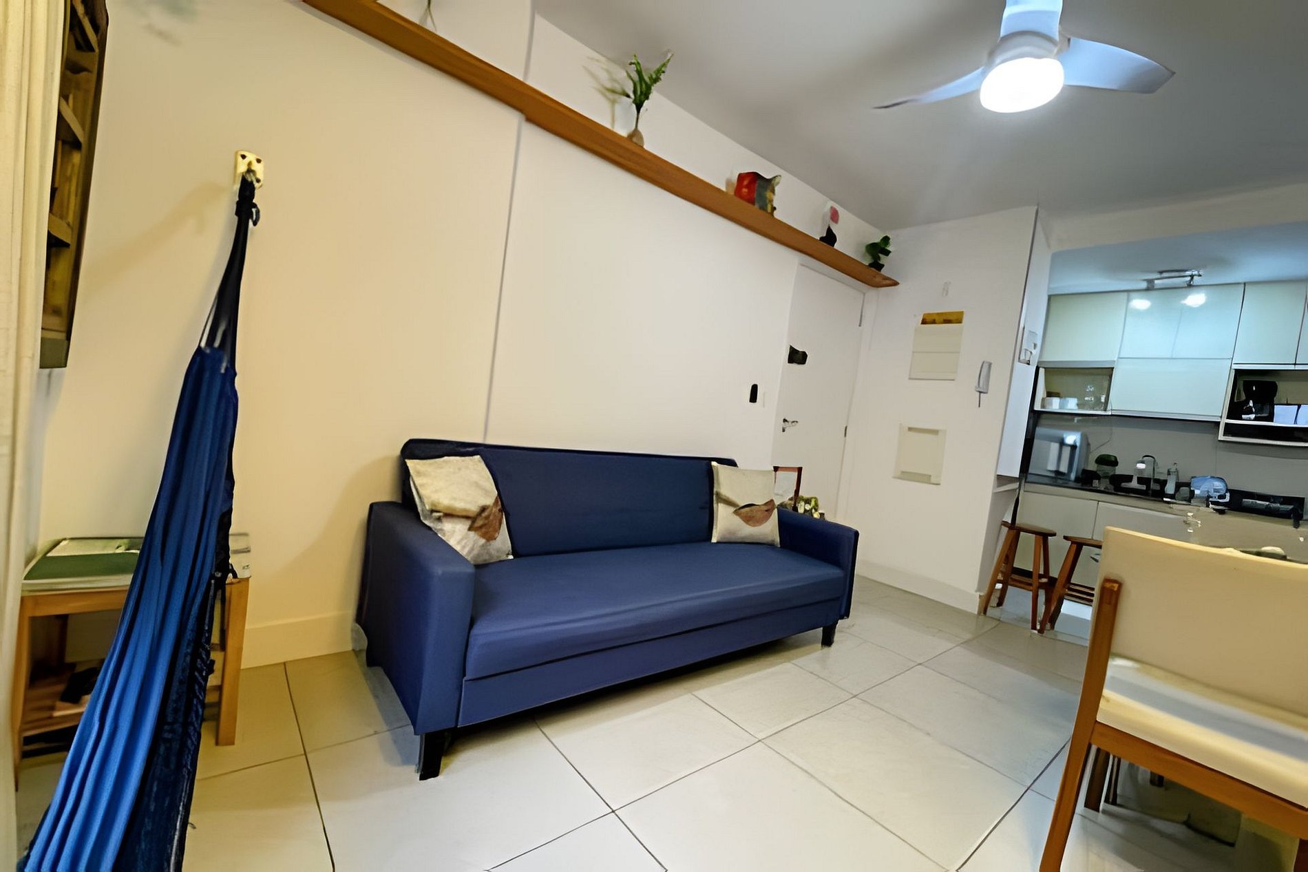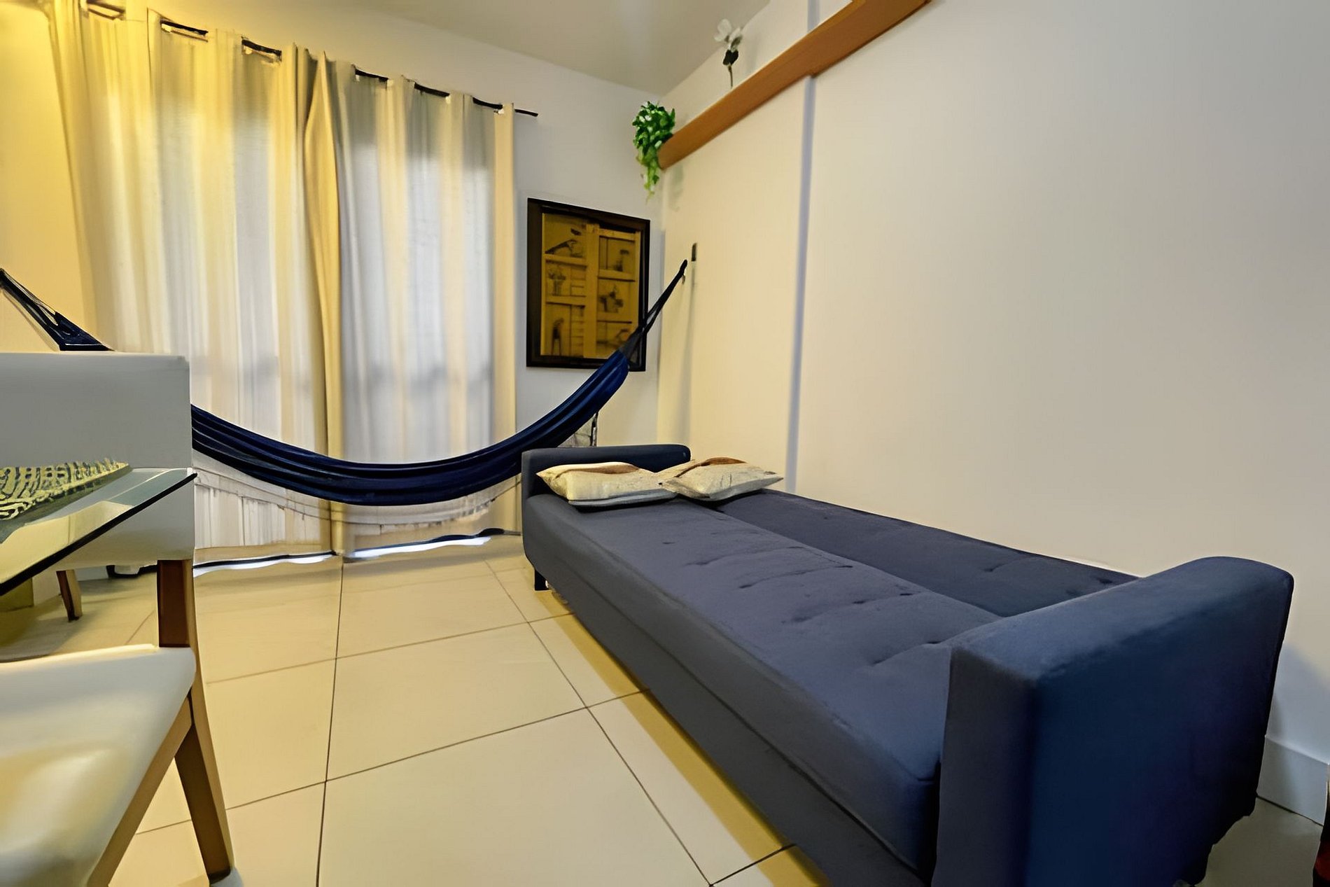 Equipado com 01 quarto com 01 cama de casal, ar-condicionado split e também ventilador de teto e grande roupeiro com cabides. Possui blackout na cortina, garantindo uma noite de sono tranquila e confortável.