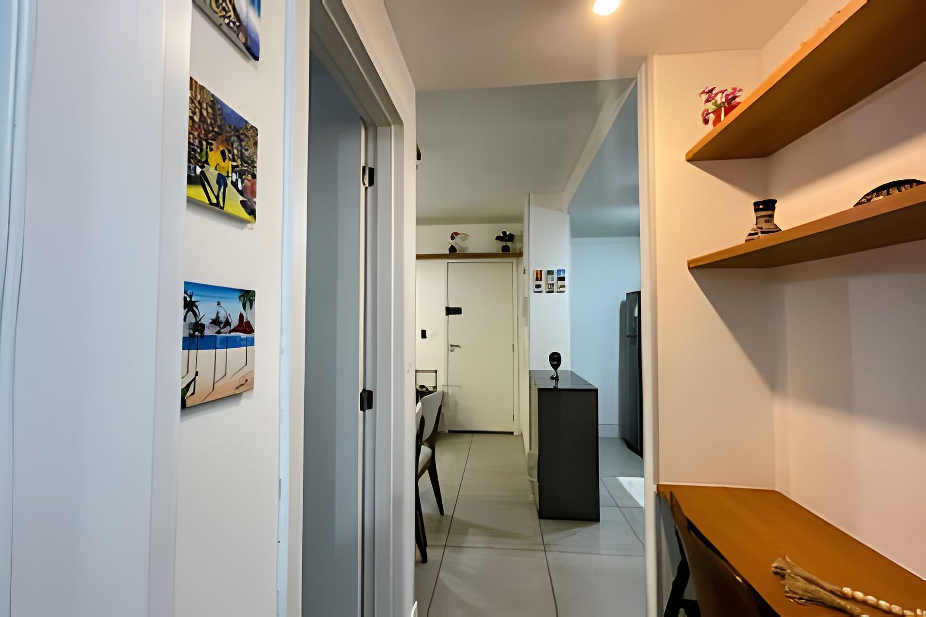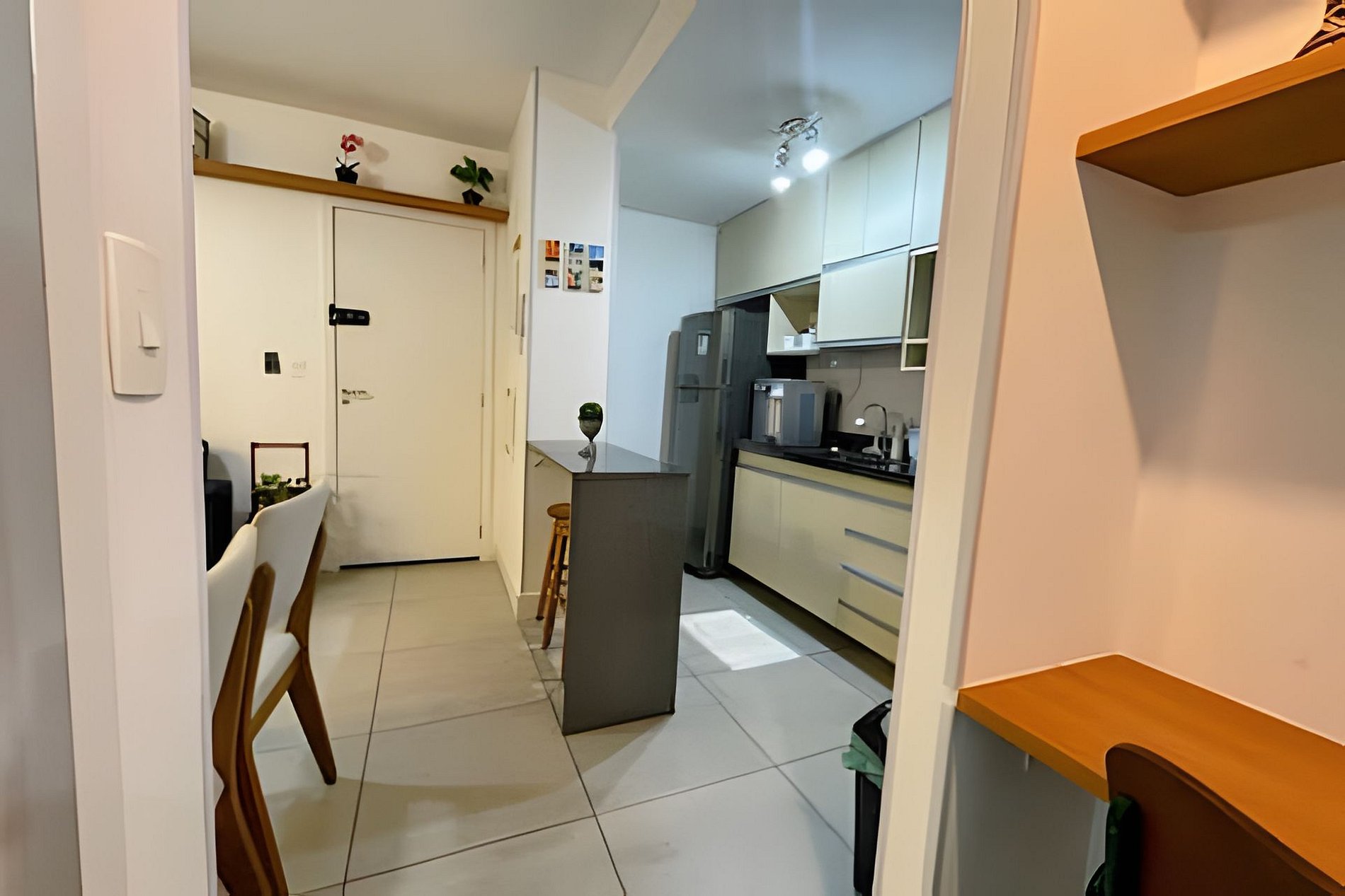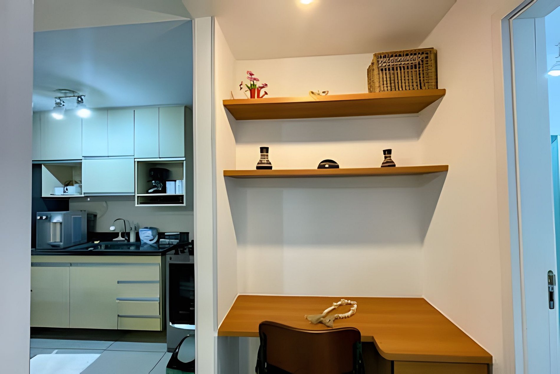 Escrivaninha no corredor com 01 cadeira para home-office. Possui WI-FI.
