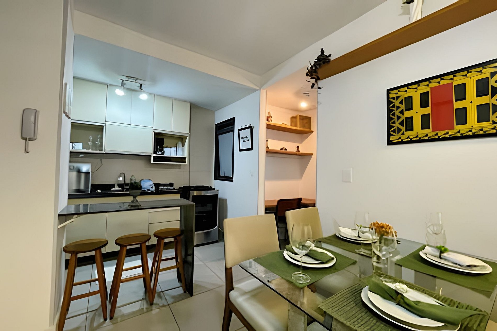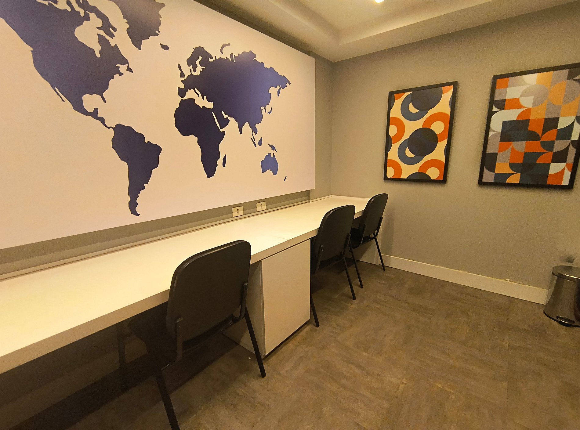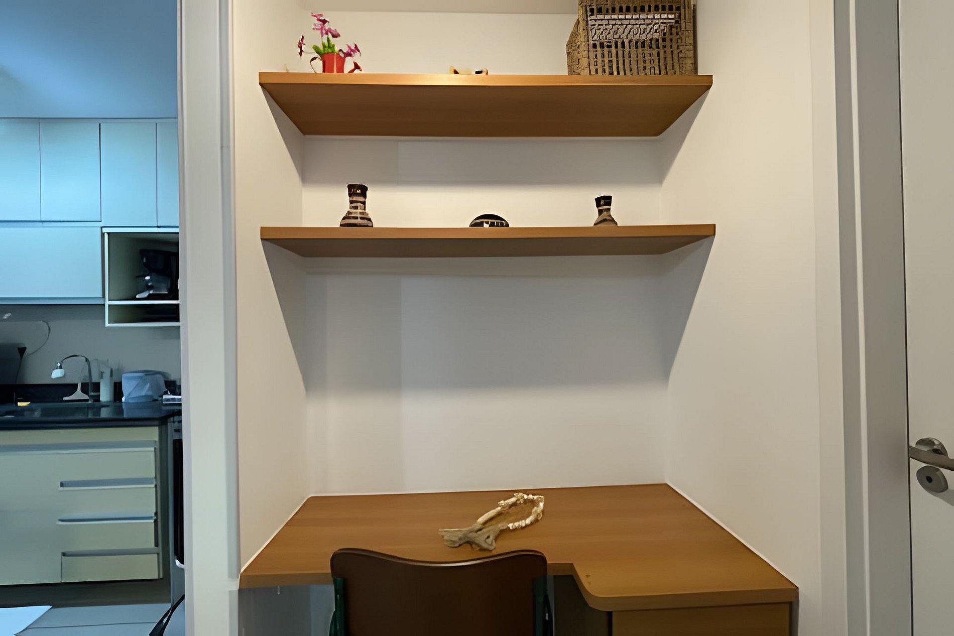 Escrivaninha no corredor com 01 cadeira para home-office. Possui WI-FI.
