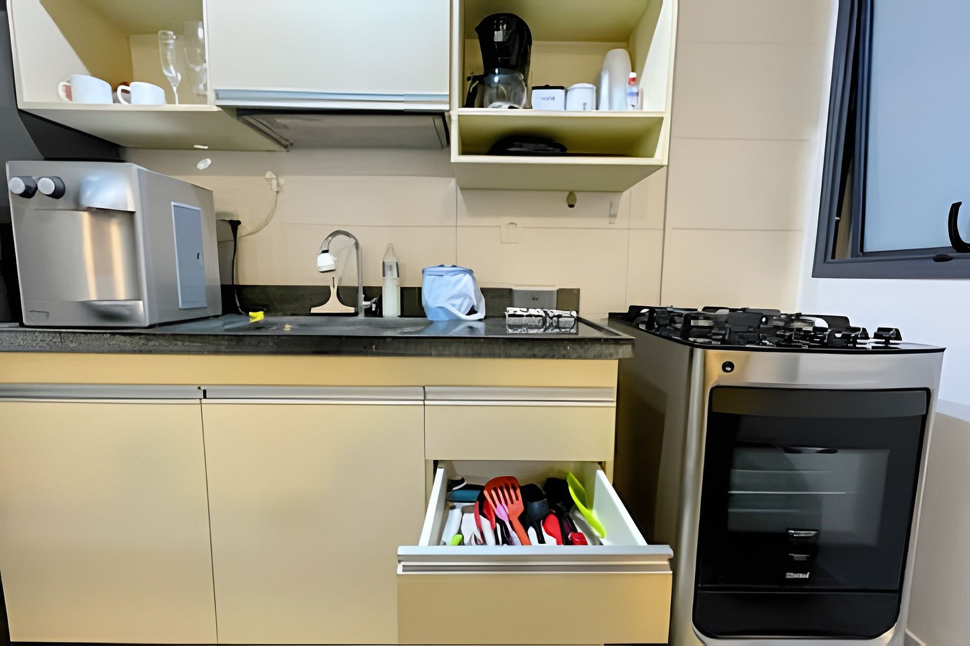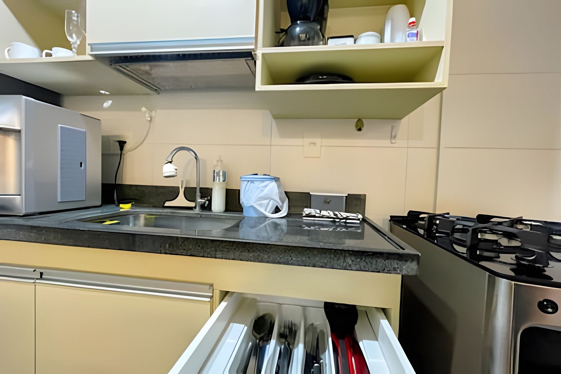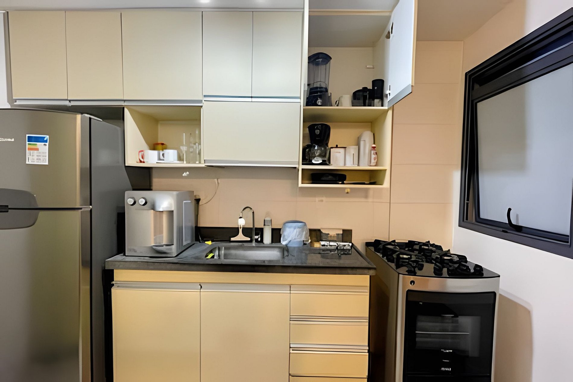 Cozinha com geladeira, fogão e forno convencionais, microondas, cafeteira, liquidificador, sanduicheira, filtro de agúa natural e gelada, bem como demais utensílios domésticos para o preparo de refeições.