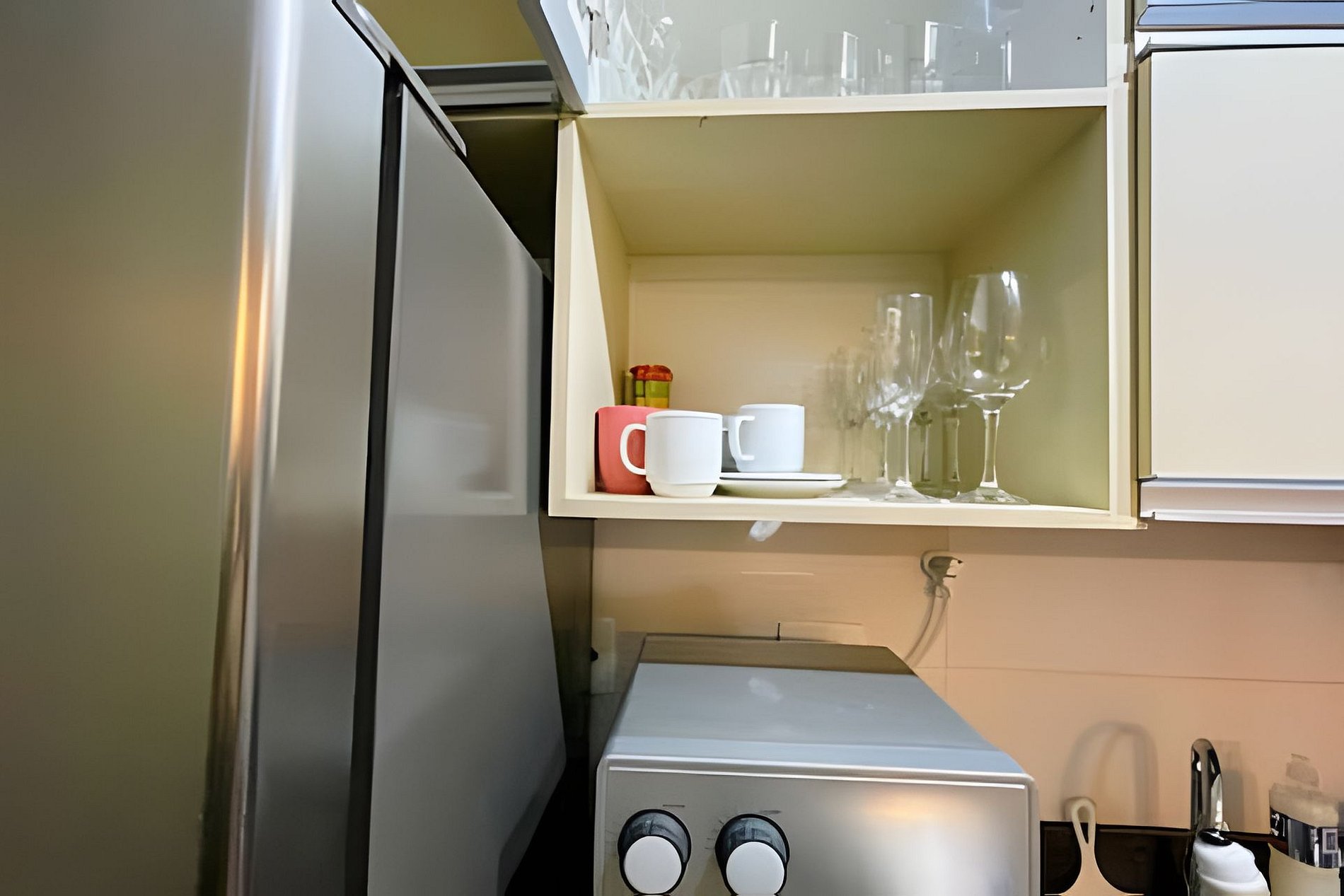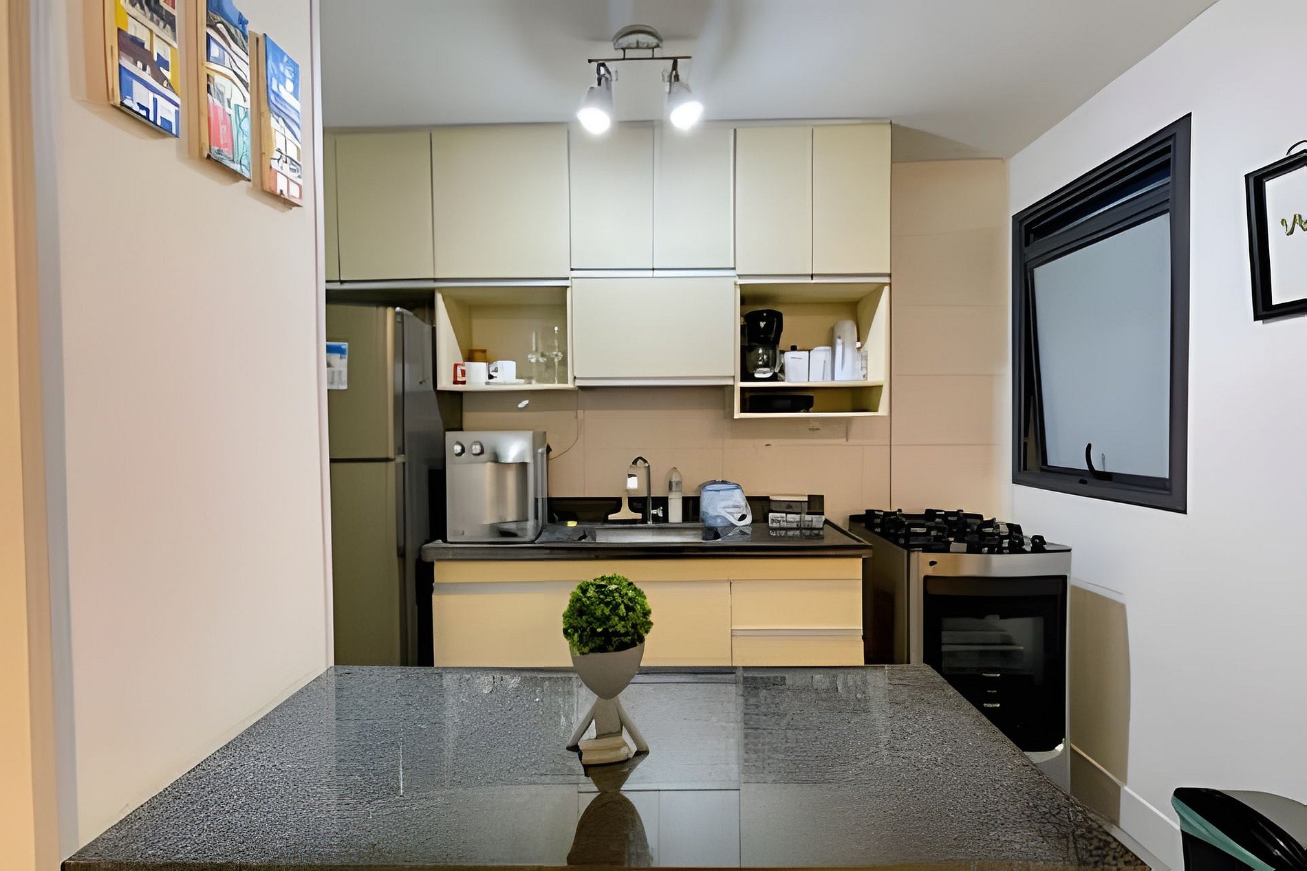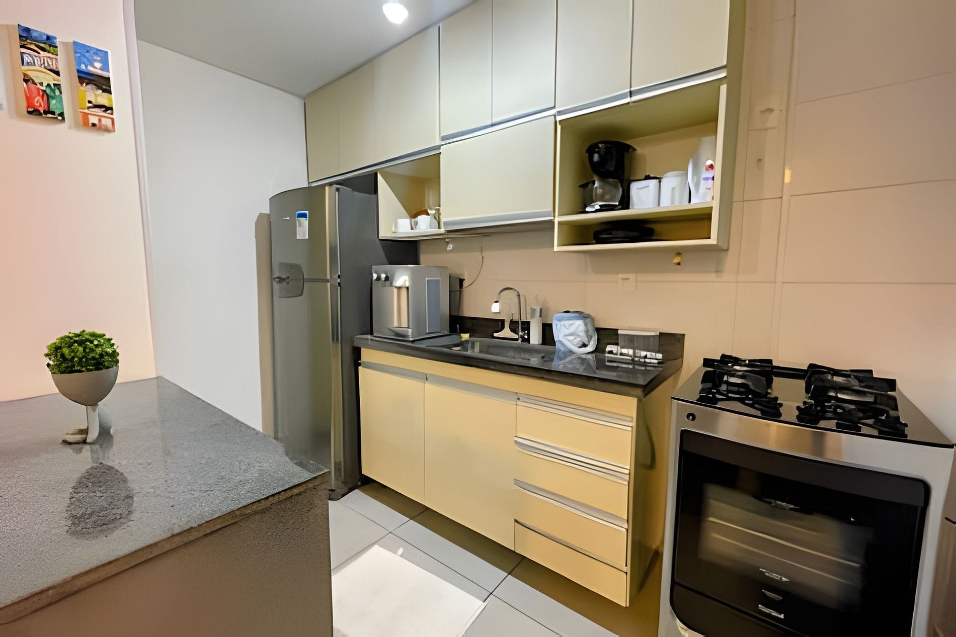 Cozinha com geladeira, fogão e forno convencionais, microondas, cafeteira, liquidificador, sanduicheira, filtro de agúa natural e gelada, bem como demais utensílios domésticos para o preparo de refeições.